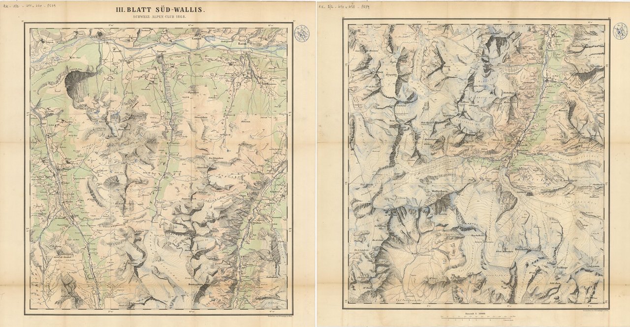 Coppia di carte geografiche con evidenziate le cime ed i ghiacciai del basso Vallese fino al Cervino con la valle del Breuil ed al Lyskamm