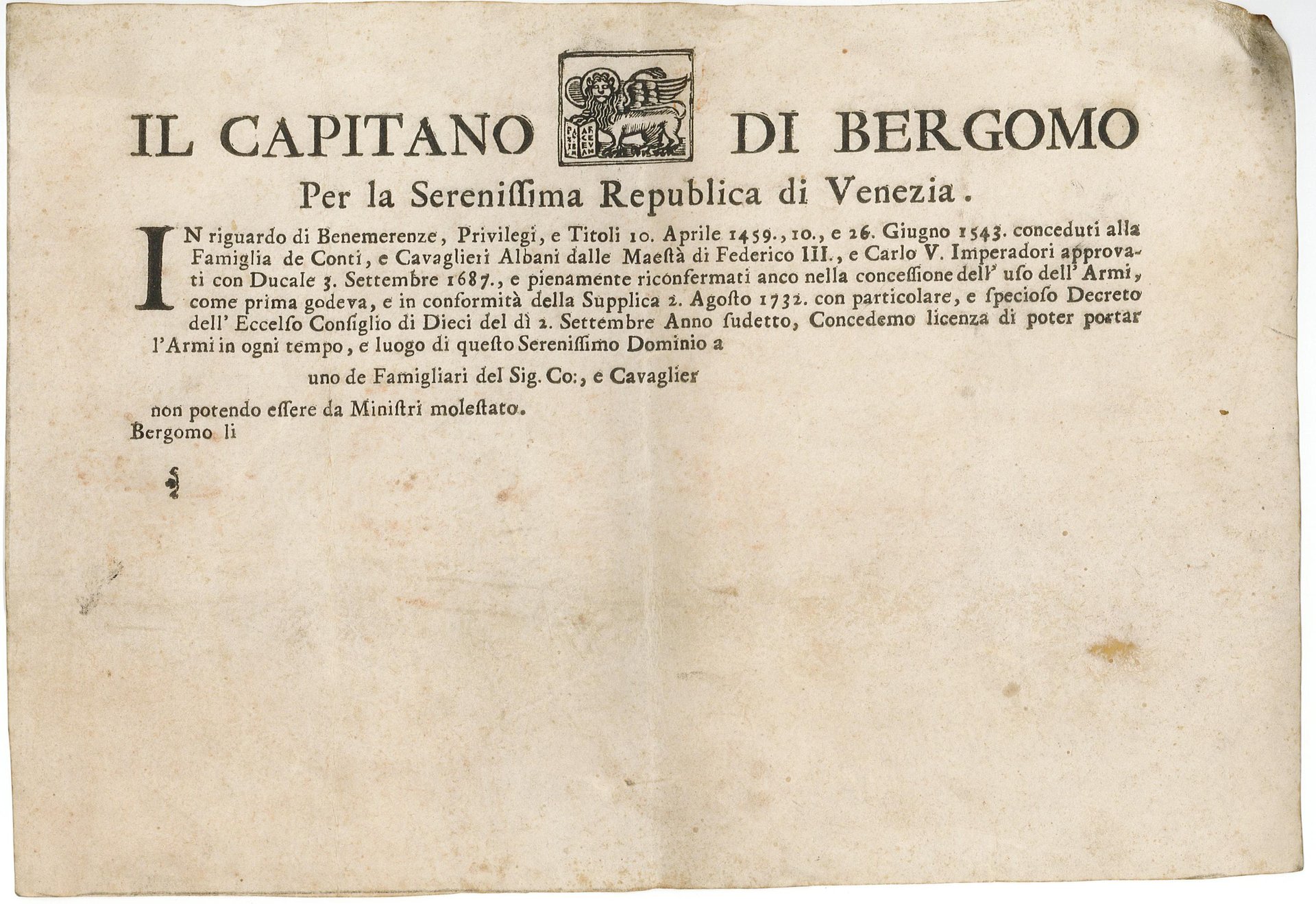 Concessione di licenza, su pergamena, di poter portar le armi in ogni tempo e luogo di questo Serenissimo Dominio a: uno dei famigliari del Sig Co:, e Cavaglier