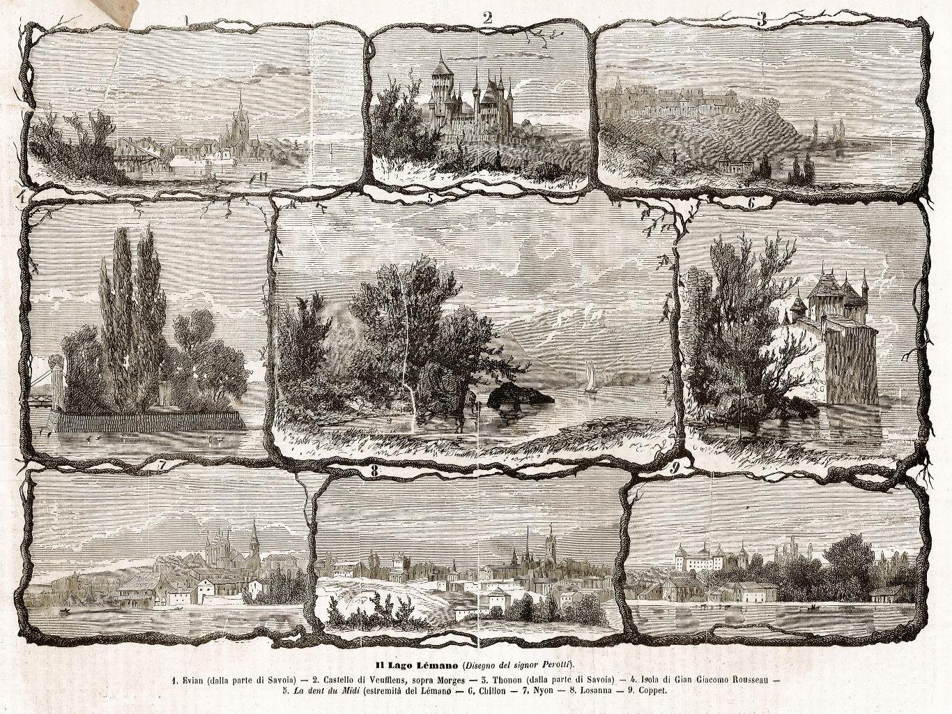 Stampa, antica ed originale, raffigurante nove vignette, raffiguranti diverse località svizzere: Evian, Veufflens, Thonon, Isola Rousseau, Chillon, Nyon, Losanna, Coppet, La Dent du Midi. Inserita in una rara pubblicazione, edita dall'Editore Edoardo Sonzogno, spesso non inserita nelle bibliografie di riferimento. Testo al retro