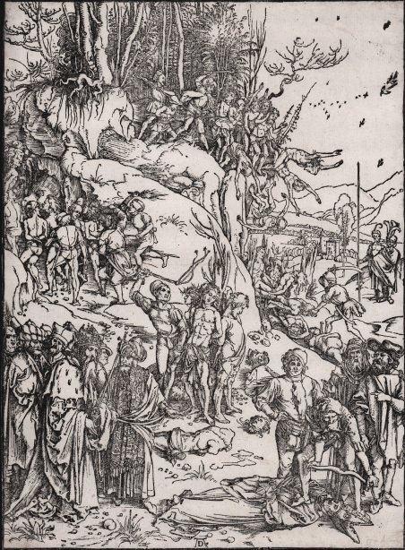 Il martirio di diecimila cristiani, sullo sfondo soldati che inseguono prigionieri sul ciglio di una rupe, al centro la tortura di un gruppo di prigionieri legati a un albero, circondati da parti del corpo smembrate, in primo piano a destra, un vescovo viene infilzato nell'occhio destro, a sinistra un gruppo di persone che assiste al martirio. Xilografia, 1496 circa, firmata con il monogramma AD in basso al centro. Buona impressione della sesta variante di sette descritta da Meder (f /g), stampata su carta vergata con filigrana "Piccolo Stemma con Croce" (Meder 151), completa della linea marginale, in ottimo stato di conservazione. Il Martirio dei diecimila è una delle prime grandi xilografie prodotte dal Maestro di Norimberga, relativa ad una decade di intenso impegno nell’intaglio (1496/1505) che lo portò tra l’altro ad incidere le tavole dell’Apocalisse, stilisticamente molto simili a questa. Il tema è molto affascinante: “Non è dato sapere se l'idea di una xilografia di questo raccapricciante soggetto sia stata di Dürer o se gli sia stata suggerita dal duca di Sassonia Frederick the Wise (Federico il Saggio), che soggiornò a Norimberga dal 14 al 18 aprile del 1496. In ogni caso, il duca rimase talmente affascinato dal soggetto che commissionò a Dürer di dipingerlo su un pannello (ora trasferito su tela) di 99 x 87 cm per la nuova Schlosskirche di Wittenberg nel 1508. La storia del martirio di diecimila cristiani compari per la prima volta nella letteratura del XII secolo, soprattutto in Germania e in Svizzera. È raccontata da Voragine nel supplemento alla Legenda Aurea e nel 1472 è stata inclusa nell'edizione di Günther Zainer del Passional oder der Heiligen Leben. Un dipinto di questo soggetto era a disposizione di Dürer anche a Norimberga, nella Augustinerkirche, realizzato dal Maestro della Pala di Sant'Agostino. Tuttavia, la figura prominente del vescovo a cui viene cavato l’occhio in primo piano nella xilografia, è assente dal dipinto. Compare, invece, in una tela del primo Quattrocento con lo stesso soggetto, proveniente dalla bassa valle del Reno e oggi conservata a Colonia. Per la composizione di questo foglio a più figure, Dürer sembra essersi ispirato al "rogo delle reliquie di Giovanni Battista" di Geertgen tot Sint Jans, che si trovava ad Haarlem al tempo. L'opera, che si trova ora a Vienna, avvalora l'ipotesi che Dürer abbia visitato i Paesi Bassi durante i suoi viaggi come apprendista. L'influenza di Mantegna si nota nel gruppo di tre martiri che vengono frustati al centro. La figura centrale è simile a quella di Cristo nella Flagellazione di Martina Schongauer (B.12). Il torso decapitato a terra ha una certa somiglianza con i disegni di un antico marmo della Casa Sassi a Roma, che Dirck Volckertsz Coornhert ritenne abbastanza importante da incidere nel 1553. Rupprich cita questo busto come prova che Dürer visitò Roma durante il suo viaggio italiano del 1494-95. Il gruppo a sinistra è stato identificato come l'imperatore romano Adriano (117-138 d.C.) con diversi potenti orientali, il più importante dei quali sarebbe Sapor II di Persia. Il vescovo torturato a destra è stato identificato come Sant’Acacio. Secondo una leggenda, l'imperatore Adriano aveva stipulato un contratto con il principe pagano Acacio per aiutarlo durante una spedizione militare in Asia Minore con un esercito di 9000 uomini. Durante la marcia verso la battaglia, diversi angeli apparvero alle truppe incoraggiandole a essere coraggiose nonostante la superiorità numerica del nemico e assicurando loro la vittoria. Dopo il successo, gli angeli riapparvero e ordinarono agli uomini di recarsi sul monte Ararat dove abbracciarono il cristianesimo. Alla notizia della loro conversione, l'infuriato Adriano ordinò di ucciderli tutti. Durante il martirio, altri mille uomini si unirono a loro in segno di ammirazione. In conformità con questa storia, il dipinto della predella a Norimberga . The Martyrdom of the Ten Thousand Christians, in the background soldiers chase prisoners over a cliff edge, in the middleground the torture of a group of prisoners tied to a tree, surrounded by body parts, in the right foreground a bishop is drilled into his right eye, on the left a group a people onlooking. Woodcut, circa 1496, signed with monogram at lower center. A good Meder f (of g) impression, printed on laid paper with “Small Coat of Arms with Cross” watermark (Meder 151), complete of the borderline, very good condition. The Martyrdom of the Ten Thousand is one of the first major woodcuts produced by the Nuremberg Master, relating to a decade of intense carving endeavor (1496/1505) that led him, among other things, to carved the plates of the Apocalypse, stylistically very similar to this one. The theme is very fascinating: “It is not recorded whether the idea for a woodcut of this gruesome subject was Dürer's own or whether it was perhaps suggested to him by Duke Frederick the Wise of Saxony who stayed at Nuremberg from 14 to 18 April of 1496, at which Occasion Dürer painted the prince's portrait.' In any event, Frederick the Wise was fascinated enough by the subject that he commissioned Dürer to paint it on a panel (now transferred onto canvas) measuring 99 x 87 cm for the new Schlosskirche in Wittenberg in 1508. The story of the martyrdom of ten thousand Christians first appears in literature during the twelfth century, primarily in Germany and Switzerland. It is told by Voragine in the supplement to the Legenda Aurea and in 1472, it was included in Günther Zainer's edition of Passional oder der Heiligen Leben. A painting of this subject was also available to Dürer at Nuremberg in the Augustinerkirche, painted by the Master of the St. Augustine Altarpiece. However, the prominent figure of the bishop, whose eye is being drilled out in the foreground of the woodcut, is notably absent from the painting. It does appear on an early fifteenth century canvas of the subject from th