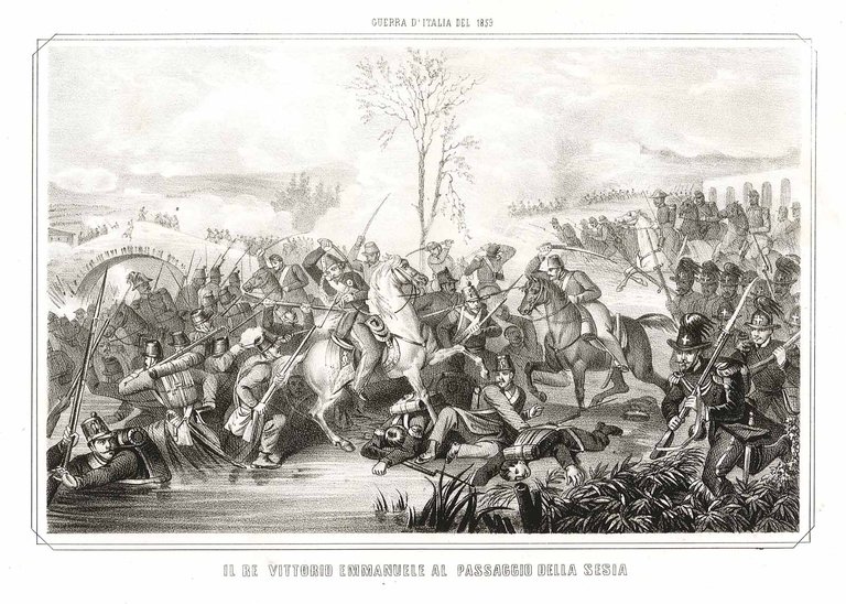 Rappresentazione del Re Vittorio Emanuele durante la battaglia sul fiume Sesia (Piemonte). Opera tratta da "La Guerra d'Italia del 1859" di Di Lorenzo A., stampata a Napoli nel 1860 da Eduardo Duclère.