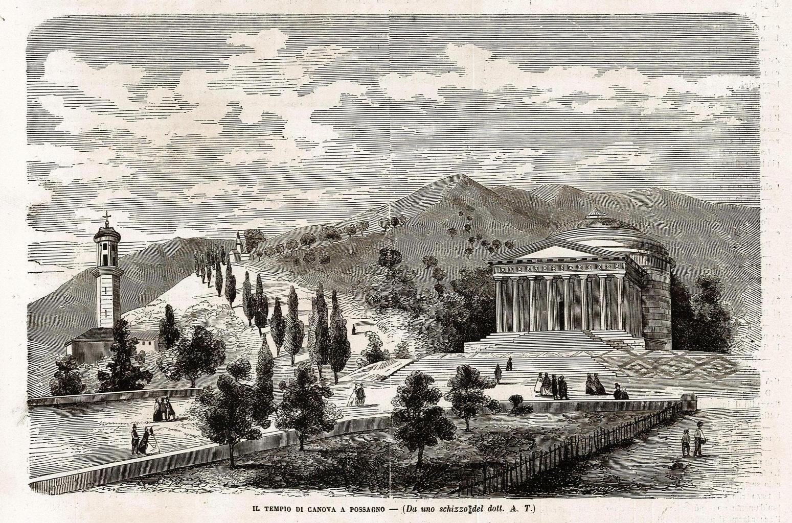 Stampa, antica ed originale, raffigurante la veduta del tempio progettato da Canova, Inserita in una rara pubblicazione, edita dall'Editore Edoardo Sonzogno, spesso non inserita nelle bibliografie di riferimento. Testo al retro