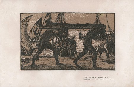 Xilografia a due legni, 1908, priva di firma. Impressione eccellente su carta avorio liscia. Ottimo stato di conservazione. Ampi margini oltre la linea marginale. Nel primo decennio del 1900, De Carolis dedica molta attenzione alla rievocazione di temi popolari, legati in particolare alle raffigurazioni di marine, così come testimonia questa stampa. L'utilizzo di più colori e quindi di un numero maggiore di legni ben si adatta alla vivacità di questi soggetti. Dopo l'adesione nel '96 al gruppo romano ' In arte libertas, ' creato dal paesista Nino Costa, dal 1901 insegna ornato in accademia nella Firenze dei maestri del Rinascimento, del "terribile" Michelangelo, del Böcklin dell'Isola dei morti. Comincia ad ornare libri per D'Annunzio e Pascoli e dal 1903 elabora fregi e d articoli per la rivista "Leonardo" fondata con Papini e Prezzolini. ' Fra le rigogliose figurazioni per la Francesca da Rimini (1902), le rusticane de La figlia di Iorio (1904), le lapidarie del Notturno del "Vate" (1917-21), le stampe marinaresche esprimono un'autonoma poetica. Il varo, L'argano, Il timone, La foce, Le arche - xilografie eseguite fra il 1904 e il 1908, mentre in Europa esplodono primi fenomeni d'avanguardia - denotano un lirismo contemplativo invischiato nel ristagno simbolista che connota la situazione italiana all'avvio del secolo. Ma al di là dei convenzionali significati latenti, quelli manifesti aprono - pur aderendo al fervore estetico del giapponismo fin-de-siècle - un discorso etnografico che si fa via via più urgente, teso a documentare l'irripetibile patrimonio che la "novella civiltà livellatrice" viene annientando. L'appello del 1920 (L'arte popolare, in "La Fionda", Roma) riscuote entusiastiche risposte, stimolando una sensibilità che nel 1923 porta all'istituzione del Regio Museo di etnografia italiana, dal 1956 Museo Nazionale delle Arti e Tradizioni popolari. Woodcut, 1908, ' printed from two blocks. Excellent impression, printed on ivory paper, wide margins, good condition. De Carolis was an artistic polymath, working as a painter (in particular of murals), interior designer, decorator, xylographer (wood engraver), illustrator and photographer, and is probably the best known exponent of Art Nouveau in Italy. His talent and originality was quickly recognised by two of the greatest Italian writers and poets of the day, Gabriele D'Annunzio and Giovanni Pascoli, and he became their preferred illustrator. Among his most popular works were many illustrations for ' Gabriele d'Annunzio's novels (Il Notturno, ' La figlia di Jorio) and ' Giovanni Pascoli‘s books of poems. In the first decade of the 1900s, De Carolis devoted a great deal of attention to the evocation of popular themes, linked in particular to representations of seascapes, as this print testifies. The use of more colors and therefore a greater number of woods is well suited to the liveliness of these subjects. After joining in '96 the Roman group In arte libertas, created by the landscape painter Nino Costa, from 1901 he taught ornament in the academy in Florence of the Renaissance masters, of the "terrible" Michelangelo, of Böcklin of the Isle of the Dead. He began to decorate books for D'Annunzio and Pascoli and since 1903 elaborates friezes and articles for the magazine "Leonardo" founded with Papini and Prezzolini. ' Among the luxuriant figurations for the Francesca da Rimini (1902), the rusticane of The daughter of Iorio (1904), the lapidarie of the Nocturne of the "Vate" (1917-21), the prints marinaresche express an autonomous poetic. Il varo, L'argano, Il timone, La foce, Le arche - woodcuts made between 1904 and 1908, while the first avant-garde phenomena were exploding in Europe - denote a contemplative lyricism caught up in the symbolist stagnation that characterized the Italian situation at the beginning of the century. But beyond the conventional latent meanings, the manifest ones open - while adhering to the aesthetic fervor of Japanism fin-de-siècle - an ethnographic discourse that becomes more and more urgent, aimed at documenting the unique heritage that the "new leveling civilization" is annihilating. The appeal of 1920 (L'arte popolare, in "La Fionda", Rome) received an enthusiastic response, stimulating a sensitivity that in 1923 led to the establishment of the Royal Museum of Italian Ethnography, since 1956 the National Museum of Popular Arts and Traditions. Cfr.
