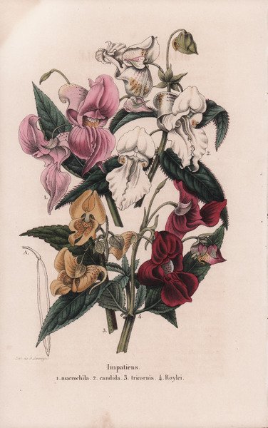 Cromolitografia, circa 1851-57, tratta dal ' Journal des Jardins. La Belgique Horticole des Serres et des Vergers. Queste stampe riccamente colorate provengono dai primi numeri della rivista belga di orticoltura ' La Belgique Horticole. ' ' Pubblicata tra il 1851 e il 1885, la rivista si concentrava su questioni relative al giardino, al frutteto e alla serra. ' ' ' È considerata da molti come la guida della rinascita dell'orticoltura belga nel XIX secolo. ' ' Le tavole cromolitografiche incluse nella rivista ritraevano fiori, frutti e funghi. La rivista fu pubblicata inizialmente sotto la direzione di Charles Morren (1807-1858) e successivamente dal figlio Édouard (1833-1886). ' ' ' Sia il padre che il figlio erano botanici e professori universitari e furono direttori del Jardin botanique de l'Université de Liège. L'anziano Morren è noto anche per aver coniato il termine fenologia, che si riferisce allo studio dei cicli stagionali di animali e piante. Le litografie di molte tavole sono state realizzate dal litografo belga Guillaume Severeyns (1829-?), ma anche da artisti come Erin Corr, Jozef Linnig e Michael Verzwyvel. Chromolithograph, ca. 1851-57, taken from the ' Journal des Jardins. La Belgique Horticole des Serres et des Vergers. These richly colored prints are from early issues of the Belgian horticultural journal ' La Belgique Horticole. ' Published between 1851 and 1885 the journal focused on issues relating to the garden, orchard and greenhouse. ' It is regarded by many as leading the revival of Belgian horticulture in the 19th century. ' The chromolithographic plates included in the journal portrayed flowers, fruits and mushrooms. The journal was originally published under the direction of Charles Morren (1807-1858) and later by his son Édouard (1833-1886). ' Both father and son were botanists and university professors, and served as Directors of the ' Jardin botanique de l'Université de Liège. The elder Morren is also known for coining the term phenology, referring to study of the seasonal cycles of animals and plants. The lithography for the many of the plates were done by the Belgian lithographic artist Guillaume Severeyns (1829-?), but also included artists like Erin Corr, Jozef Linnig and Michael Verzwyvel. Cfr.