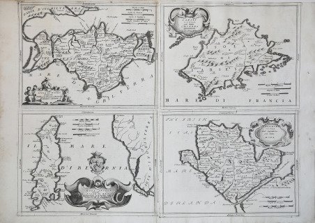 Magnifica carta di Coronelli raffigurante le quattro isole del Canale della Manica dal monumentale Corso Geografico Universale pubblicato a Venezia nel 1690. Mostra l'Isola di Wight, l'Isola di Man, Jersey e Anglesey in modo molto dettagliato con città più grandi, nomi di luoghi, fiumi e canali. Le mappe sono tutte impreziosite da cartigli decorativi. Opera tratta dal ' Corso geografico universale, o sia la terra divisa nelle sue parti e subdistinta ne' suoi gran regni. Esposta in tavole geografiche ricorrette et accresciute di tutte le nuove scoperte, ad uso dell'Accademia Cosmografica degli Argonauti dal Padre Maestro Vincenzo Coronelli M. C. Cosmografo della Serenissima Republica di Venetia. Dedicata alla Santità di Nostro Signore Innocenzo XII. P. I. In Venetia, a spese dell'autore. MDCXCII. Coronelli visse un periodo di straordinaria fecondità editoriale a partire dal 1689, quando ebbe la cattedra di geografia presso l'Università alle Procuratie, con la pubblicazione, nel 1690, del primo volume dell'Atlante Veneto. In effetti sotto il nome di ' Atlante Veneto ' va tutta la raccolta di tredici opere composte nell'arco del decennio successivo, dall'Isolario ' allo ' Specchio del mare. In realtà solo alcune di tali opere possono definirsi atlante, e sono di valore molto disuguale, dato che si passa da opere originali e fondamentali come quelle citate o il ' Corso Geografico ' ad opere di compilazione o semplici raccolte di vedute. Il ' Corso Geografico ' uscì in diverse edizioni con numeri diversi di carte - sessantotto tavole nel 1689-92; di centosettantatré tavole nel 1692; duecentosessanta tavole, nel 1694-97 - che venivano vendute anche separatamente, al ritmo di sei carte al mese per due anni. Le carte furono incise tra il 1688 e il 1692 nell'attrezzatissima officina cartografica del convento dei Frari, dove lavoravano anche incisori stranieri. ' Acquaforte, impressa su carta vergata coeva, consueta traccia di piega centrale, per il resto in ottimo stato di conservazione. Magnificent Coronelli's 4 maps on one sheet from the monumental ' Corso Geografico Universale ' published in Venice in 1690. Shows the ' Isle of Wight, ' Isle of Man, ' Jersey and Anglesey ' in very nice detail with ' larger towns, place names, rivers and canals. The maps are all embellished by decorative cartouches. Engraved in Coronelli's unique, and bold style with a large title cartouche, coat-of-arms, and scale of miles. The map is taken from ' Corso geografico universale, o sia la terra divisa nelle sue parti e subdistinta ne' suoi gran regni. Esposta in tavole geografiche ricorrette et accresciute di tutte le nuove scoperte, ad uso dell'Accademia Cosmografica degli Argonauti dal Padre Maestro Vincenzo Coronelli M. C. Cosmografo della Serenissima Republica di Venetia. Dedicata alla Santità di Nostro Signore Innocenzo XII. P. I. In Venetia, a spese dell'autore. MDCXCII. Coronelli lived a period of extraordinary editorial fecundity starting from 1689, when he had the chair of geography at the University at the Procuratie, with the publication, in 1690, of the first volume of the ' Atlante Veneto. Under the name of ' Atlante Veneto ' goes the entire collection of thirteen works composed over the next decade, from the ' Isolario ' to the ' Specchio del mare. ' In reality, only some of these works can be defined as atlas, and are of very unequal value, since we go from original and fundamental works such as those mentioned or the ' Corso Geografico ' to works of compilation or simple collections of views. The ' Corso Geografico ' came out in several editions with different numbers of maps - sixty-eight maps in 1689-92; one hundred and seventy-three maps in 1692; two hundred and sixty maps in 1694-97 - which were also sold separately, at the rate of six a month for two years. The maps were alle engraved between 1688 and 1692 in the well-equipped cartographic workshop of the Frari convent, where foreign engravers also worked. ' Copper engraving, printed on contemporary laid paper, central vertical fold, in good condition. Cfr.