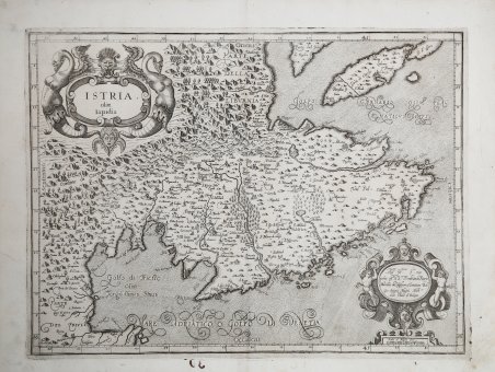 Carta geografica tratta dal ' L’Italia ' a cura di Fabio Magini, edito a Bologna nel 1620, tre anni dopo la prematura morte del padre. Composto da un breve testo descrittivo di sole 24 carte, l’opera è corredata di 61 carte geografiche della penisola, e costituisce il primo esempio di atlante italiano. L’opera è per intero di mano del Magini, che iniziò la realizzazione delle carte nel 1594 circa, dando alla luce per prima nel 1595 la carta del territorio di Bologna. Tutte le carte vennero alle stampe quindi prima del 1620, nelle loro stesure provvisorie, successivamente corrette ed aggiornate per l’edizione definitiva. Per la realizzazione delle lastre il Magini si servì di due dei più famosi intagliatori dell’epoca: il belga Arnoldo Arnoldi e l’inglese Benjamin Wright. La carta dell’Istria è probabilmente opera del Magini stesso, in quanto la carta di Pietro Coppo (1520) e quelle di Bertelli e Camocio (1569), risultano molto diverse nel rilievo del territorio. ' Questo lascia presupporre che il Magini abbia avuto tra le mani una carta inedita probabilmente fornitagli direttamente dalla Repubblica Veneta. ' Almagià nota come questa sia una delle rare eccezioni nell’opera dell’astronomo padovano, in quanto la lastra non risulta cancellata e corretta in nessun modo. ' Probabilmente la lastra venne iniziata dall’Arnoldi e terminata dal Wright. ' Nel cartiglio in alto a sinistra il titolo ISTRIA olim Iapidia. Nel cartiglio in basso a destra la dedica All’ Ill.mo S.or mio p[ad]rone oss.mo il S.or ' Ferdinandom Riario Marchese di Castiglione & Senatore Bol: segue la firma Gio. Antonio Magini ' Math co dello studio di Bologna. sotto il cartiglio la scala grafica Scala di Miglia dieci (10 miglia pari a mm40). Nell’angolo in basso a sinistra Ben. W. fe. ( Benjamin Wright fecit). Orientazione nei quattro lati al centro con il nome dei punti cardinali Septentrio, Meridies, Oriens, Occidens, il nord a sinistra . Graduazione ai margini di 1’ in 1’ da 44° 45’ a 45° 57’ 10’’ di latitudine, e da 35° 57’ a 37° 10’ 25’’ di longitudine. Lieve gora nei margini, nel complesso in ottimo stato di conservazione. Bibliografia Almagià (1922): pp. 46-47; Almagià (1929): p. 39b; Lago-Rossit (1981): pp. 148-153, Tav. LXXII; Lago (1989): pp. 271-273, n. 195; Marinelli (1881): p. 147, n. 704. Map taken from ' L'Italia ' edited by Fabio Magini, published in Bologna in 1620, three years after the untimely death of his father. Composed of a short descriptive text of only 24 pages, the work is accompanied by 61 maps of the peninsula, and is the first example of an Italian atlas. The work is entirely by the hand of Giovanni Antonio Magini, who began the realization of the maps in 1594 or so; the first dated map (1595) the map of the territory of Bologna. All the maps were printed before 1620, in their provisional drafts, later corrected and updated for the final edition. For the realization of the plates Magini used two of the most famous engravers of the time: the Belgian Arnoldo Arnoldi and the English Benjamin Wright. Copperplate, in good condition. The map of Istria is probably the work of Magini itself, as the map by Pietro Coppo (1520) and those by Bertelli and Camocio (1569), are very different in the relief of the territory. This suggests that Magini had in his hands an unpublished map probably provided directly by the Venetian Republic. Probably the work was started by the Arnoldi and finished by the Wright. Nel cartiglio in alto a sinistra il titolo ' ISTRIA olim Iapidia. ' Nel cartiglio in basso a destra la dedica ' All’ Ill.mo ' S.or ' mio p[ad]rone oss.mo ' il S.or ' Ferdinandom Riario Marchese di Castiglione & Senatore Bol: ' segue la firma ' Gio. Antonio Magini ' Math ' co ' dello studio di Bologna. ' sotto il cartiglio la scala grafica ' Scala di Miglia dieci ' (10 miglia pari a mm40). Nell’angolo in basso a sinistra ' Ben. W. fe. ' ( Benjamin Wright fecit). Orientazione nei quattro lati al centro con il nome dei punti cardinali ' Septentrio, Meridies, Oriens, Occidens, ' il nord a sinistra . Graduazione ai margini di 1’ in 1’ da 44° 45’ a 45° 57’ 10’’ di latitudine, e da 35° 57’ a 37° 10’ 25’’ di longitudine. Bibliografia Almagià (1922): pp. 46-47; Almagià (1929): p. 39b; Lago-Rossit (1981): pp. 148-153, Tav. ' LXXII; Lago (1989): pp. 271-273, n. 195; Marinelli (1881): p. 147, n. 704. Cfr.