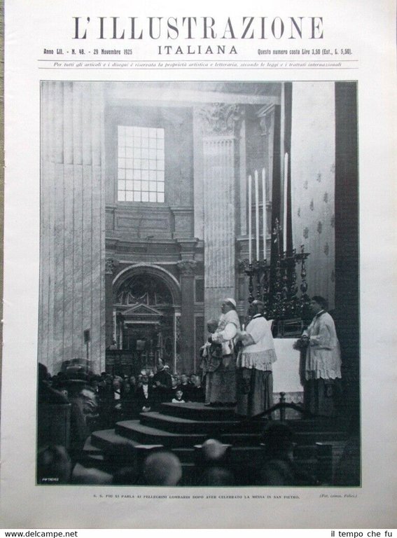 L'Illustrazione Italiana Rivista originale del 29 Novembre 1925 Anno 52 - N. 48 Rarità per appassionati e collezionisti Segue sotto solamente un saggio del ricco contenuto presente Illustrato in copertina (segue foto): Pio XI parla ai pellegrini lombardi dopo aver celebrato la messa in San Pietro Illustrazione presente nelle pagine interne (segue foto): Roma: l'inaugurazione del monumento al genio militare Altra Illustrazione presente nelle pagine interne (segue foto): Città italiane viste dalla carlinga: Milano Tra gli argomenti trattati e le notizie contenute: La morte della regina madre d'Inghilterra Il passaggio di De Pinedo in Giappone e nelle Filippine I monumenti dell'antica Roma L'Italia pittoresca: Siracusa, l'orecchio di Dionisio Il canale della vittoria inaugurato a Nervesa Della Battaglia Pellegrini italiani in Palestina .e tanto altro ancora! Qualora vogliate maggiori delucidazioni contattateci. In questo negozio troverai un'intera categoria dedicata alla collezione dell'Illustrazione Italiana , ne inseriamo diverse giornalmente. Sotto il link diretto a tutta la collezione: Riviste disponibili Cliccaci sopra, troverai di certo ciò che cerchi! L'illustrazione Italiana è stata una rivista settimanale italiana con sede a Milano, pubblicata ininterrottamente dal 1873 al 1962 per un totale di quasi 5 000 numeri. Fondata a Milano con la testata «Nuova illustrazione universale», fu edita dalla casa editrice Fratelli Treves, fondata da Emilio Treves, il quale fu anche il primo direttore della rivista. L'illustrazione italiana comincia ad avere un'ampia diffusione negli ambienti della medio-alta borghesia, grazie alla qualità degli articoli e soprattutto delle illustrazioni, spesso affidate ad artisti di primo piano come Achille Beltrame, Pietro Scoppetta, Luigi Bompard, Giuseppe Cosenza ed Ettore Ximenes (il quale svolgeva anche le funzioni di vicedirettore), tale qualità fu mantenuta poi nel tempo anche in seguito all'avvento della fotografia, tecnica che vide rappresentati sulle pagine dell'«Illustrazione» alcuni tra i migliori fotogiornalisti nazionali: Armando Bruni, Mario Crimella, Giulio Parisio ed Emilio Sommariva. Per i testi il periodico si avvalse della collaborazione, in qualità di articolisti, di alcuni dei nomi più importanti della letteratura italiana, fra cui ricordiamo Giosuè Carducci, Grazia Deledda e Luigi Pirandello (premi Nobel per la letteratura), lo scrittore verista Giovanni Verga, il poeta Gabriele D'Annunzio, il critico letterario e favolista Luigi Capuana ed Edmondo De Amicis, autore del celeberrimo romanzo "Cuore", capolavoro della letteratura per ragazzi. La grande fortuna dell'Illustrazione Italiana durò fino alla morte di Emilio Treves (1916), dopo la quale, pur avendo ancora tra i propri collaboratori scrittori del calibro di Eugenio Montale, Elio Vittorini, Salvatore Quasimodo, Riccardo Bacchelli, Italo Pietra, Niccolò Giani e Sergio Solmi, la rivista cominciò a mostrare i segni di un lento declino. La promulgazione delle leggi razziali fasciste accelerò il processo in atto: nel 1939 la Treves dovette cedere l'azienda alla Garzanti. Verso la metà del 1942, in seguito agli eventi della seconda guerra mondiale, L'illustrazione rallentò le sue uscite, fino ad essere trasformata in mensile nel 1951 da Livio Garzanti. Gli anni cinquanta videro la crescita vertiginosa dei rotocalchi, settimanali popolari di attualità. «L'Illustrazione Italiana» vide ridursi progressivamente il suo spazio, finché Garzanti la chiuse nel 1962. L'editore Guanda riprese la testata alla fine del 1981 e la ripubblicò con periodicità bimestrale. Il tentativo non incontrò sufficiente fortuna e la rivista fu chiusa nel 1996. Paypal Carta di credito Bonifico bancario Spedizione con posta ordinaria o raccomandata scelta dall'Acquirente nel momento del pagamento