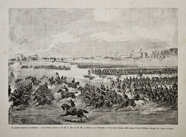 La grande manovra di cavalleria / La rivista passata da S. M. il Re e da S. M. la Regina alla Divisione di Cavalleria di Novara, nella piazza d’Armi di Milano