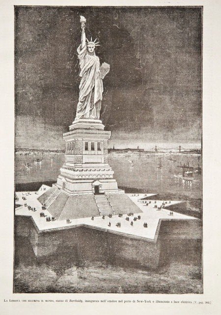 La Libertà che illumina il mondo, statua di Bartholdy, inaugurata nell’ottobre nel porto di New-York e illuminata a luce elettrica