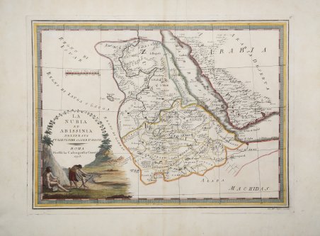 - EDIZIONE ORIGINALE, COLORITURA COEVA -Bella e decorativa carta geografica del territorio nord-orientale dell'Africa, che comprende la regione dell'Egitto meridionale e dell'Etiopia tratta dal "Nuovo Atlante Geografico Universale delineato sulle ultime osservazioni", edito a Roma dal 1792 fino al 1801, opera che la Calcografia Camerale commissionò al Cassini al fine di sostituire l’ormai obsoleto "Mercurio Geografico".Giovanni Maria Cassini, Chierico Regolare Somasco fu geografo e cartografo, ma anche intagliatore di architetture e prospettive - uno dei migliori discepoli di Giovanni Battista Piranesi - Cassini fu uno degli ultimi sferografi italiani del Settecento ed i suoi globi ebbero una notevole diffusione, come pure questo "Nuovo Atlante Geografico".Incisione in rame, coloritura coeva dei contorni, leggere bruniture, per il resto in ottimo stato di conservazione.L'Atlante del Cassini fu ristampato dalla Calcografia Camerale nel primo quarto del XIX secolo, prima del 1839. Solo gli esemplari di prima edizione come questo sono stampati su carta vergata coeva e sono colorati a mano in epoca. Le tirature del XIX secolo sono già su carta meccanica, priva di vergelle, e generalmente in bianco e nero. FIRST EDITION, CONTEMPORARY OUTLINE COLOUR -The Italian painter and engraver, Giovanni Maria Cassini, produced this interesting map of southern Egypt and northern Ethiopia.Published in: Nuovo atlante geografico universale delineato sulle ultime osservazioni. Roma, Calcografia camerale, 1792-1801.Cassini was geographer and cartographer but he was also good at engraving architectural items and perspectives – he was one of the best disciples Giovanni Battista Piranesi had. Moreover, Cassini was one of the last artists to engrave spheres in the XVIII century and his globes were quite famous and widespread, and realized the most important Italian Atlas of the XVIII century; his maps always bear a cartouche, extremely rich in colours and details. Copperplate with fine original hand colour, some foxing, otherwise in very good condition. Cfr.