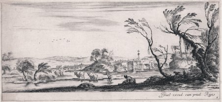 Acquaforte, circa 1630, priva della firma. Della serie Diversi paesaggi. Esemplare nel secondo stato di due con l’indirizzo di Israel in basso a destra, ed il numero 2 aggiunto. Bellissima prova, impressa su carta vergata coeva con filigrana non meglio identificata, con sottili margini, in eccellente stato di conservazione. Stefano della Bella fu uno degli incisori più interessanti e originali nella Firenze del XVII secolo e può considerarsi l’unico geniale continuatore dell’opera di Jacques Callot. La sua educazione artistica ebbe inizio a Firenze nella bottega degli orafi Gasparo Mola e Orazio Vanni, e la precisione del segno, tipica dell’arte orafa resterà caratteristica del suo stile. Studiò poi presso Giovanni Battista Vanni e forse anche presso il Cantagallina e Cesare Dandini, ma ben presto si dedicò all'incisione. Il suo vero maestro può considerarsi Jacques Callot, l’incisore francese che soggiornò a lungo a Firenze lasciando una forte impronta nel panorama artistico della città. Gli anni più importanti della sua carriera sono quelli che trascorre a Parigi, dal 1639 al 1650, stipendiato da Lorenzo de' Medici: lavorò insieme ad Israel Silvestre, con gli editori Langlois, Ciartres e Pierre Mariette, per stampatori francesi e per commissioni di gran prestigio, come quelle del 1641 per il cardinale Richelieu che gli affidò le illustrazioni delle sue imprese guerresche. Intorno al 1647, durante un viaggio in Olanda, dove eseguì le acqueforti con le vedute del porto di Amsterdam, incontrò Rembrandt e da quella data notiamo una eco profonda dell’arte dell’olandese nella grafica del Della Bella Etching, 1630 approx., not signed. From the series "Diversi paesaggi". Example in the second state of two, with Israel’s address on lower right and the addiction of number 2. Magnificent work, printed on contemporary laid paper with unknown watermark, tiny margins, in excellent condition. Stefano della Bella was one of the most interesting and original engravers in 17th-century Florence and can be considered the only brilliant continuator of Jacques Callot's work. His artistic education began in Florence in the workshop of the goldsmiths Gasparo Mola and Orazio Vanni, and the precision of sign, typical of the goldsmith's art, will remain characteristic of his style. He then studied under Giovanni Battista Vanni and perhaps also under Cantagallina and Cesare Dandini, but soon turned to engraving. His real master can be considered Jacques Callot, the French engraver who stayed in Florence for a long time and left a strong imprint on the city's artistic scene. The most important years of his career were the ones he spent in Paris, from 1639 to 1650, salaried by Lorenzo de' Medici: he worked together with Israel Silvestre, with the publishers Langlois, Ciartres and Pierre Mariette, for French printers and for commissions of great prestige, such as those of 1641 for Cardinal Richelieu, who entrusted him with illustrations of his warlike exploits. Around 1647, during a trip to Holland, where he executed etchings with views of the port of Amsterdam, he met Rembrandt, and from that date we note a profound echo of the Dutchman's art in Della Bella's graphic work. Cfr. De Vesme 758 II/II.