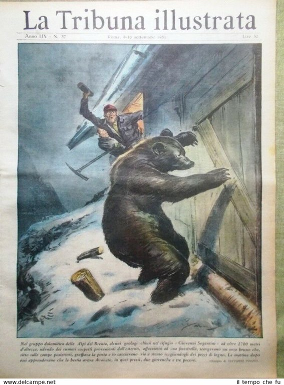 La Tribuna Illustrata Rivista originale del 9-16 Settembre 1951 Anno 59 - N. 37 Rarità per appassionati e collezionisti Seguono solo alcuni dei fatti descritti, illustrati e fotografati all'interno Illustrato in copertina (segue foto): Nel gruppo dolomitico delle Alpi del Brenta, alcuni geologi chiusi nel rifugio "Giovanni Segantini" a oltre 2700 metri d'altezza, affacciatisi a una finestra, scorgevano un orso bruno che graffiava la porta e lo cacciavano a stento lanciandogli pezzi di legno. La mattina dopo apprendevano che la bestia aveva sbranato due giovenche e tre pecore (disegno di Vittorio Pisani) Illustrato nella retro copertina (segue foto): Un negoziante di vini, dalla corporatura colossale, abitante nei dintorni di Torino, stava per prendere un bagno nell'albergo in cui alloggiava, ma appena seduto nella vasca questa andava in pezzi procurandogli varie ferite (disegno di Vittorio Pisani) Nelle pagine interne: De Gasperi, ospite illustre a Washington. Morto il chirurgo Serge Voronoff, nemico della vecchiaia. Venezia: festa grande a palazzo Labia. Un deputato costa allo stato 3 milioni l'anno. La guerra dei ritrovi notturni. La calma di Ferdi Kubler. .e tanto altro ancora! Qualora vogliate maggiori delucidazioni contattateci In questo negozio troverai un'intera categoria dedicata alle Tribune Illustrate, sotto il link diretto alla collezione: Riviste disponibili Cliccaci sopra, troverai di certo ciò che cerchi! La Tribuna Illustrata fu un settimanale italiano pubblicato a Roma. Insieme a La Domenica del Corriere e a L'Illustrazione Italiana fu il settimanale illustrato preferito dagli Italiani nel periodo che intercorse dalla fine dell'800 all'avvento della televisione. Fondato nel 1890 come supplemento del quotidiano La Tribuna, il primo numero uscì il 6 gennaio, il formato della rivista era cm 27 x 38, un formato poco più grande del tabloid. La prima ed ultima pagina erano a colori, disegnate da pittori e incisori affermati. Ogni numero conteneva 16 pagine. I principali collaboratori furono: Luigi Capuana, Adolfo De Bosis, Alfredo Fabrizi, Gandolin, Giuseppe Giacosa, Attilio Luzzato, Enrico Panzacchi, Rastignac, Attilio Sarfatti, Armand Silvestre, Ettore Socci, Gaspare Ungarelli, Pio Vanzi, Annie Vivanti. Il Corredo iconografico fu di prim'ordine. I principali pittori, disegnatori ed illustratori furono: Basilio Cascella e i figli Tommaso e Michele, Enrico Lionne, Aleardo Terzi, Augusto Bompiani, Roberto Bompiani, Domenico Bruschi, Modesto Faustini, Rubens Santoro, Rafael Senet, Cesare Tiratelli. Tra i romanzi a puntate che vi uscirono ricordiamo: L'invincibile, di Gabriele D'Annunzio Una giovinezza, di Francois Coppée e Zia Aurelia di André Theuriet, questi ultimi due entrambi illustrati da Emile Bayard. Paypal Carta di credito Bonifico bancario Spedizione con posta prioritaria o raccomandata scelta dall'acquirente nel momento del pagamento