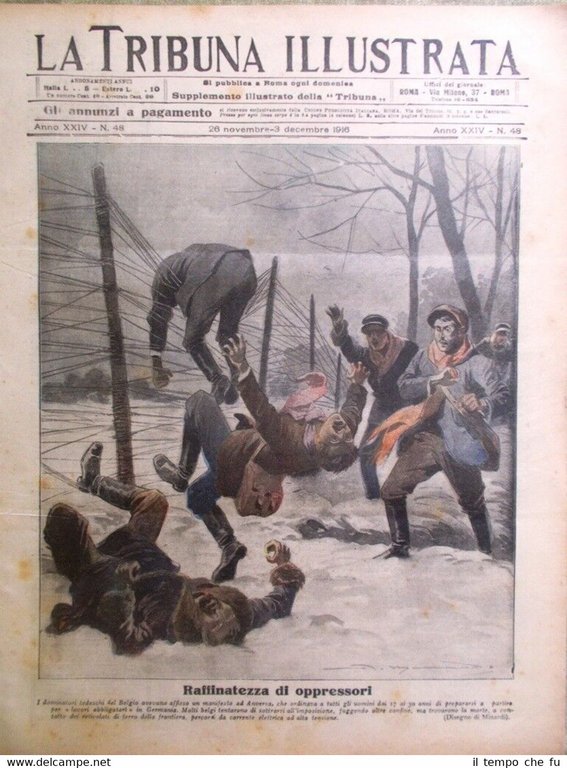 La Tribuna Illustrata Rivista originale del 26 Novembre - 3 Dicembre 1916 Anno 24 - N. 48 Rarità per appassionati e collezionisti Seguono solo alcuni dei fatti descritti, illustrati e fotografati all'interno Illustrato in copertina (segue foto): I dominatori tedeschi del Belgio avevano affisso un manifesto ad Anversa che ordinava a tutti gli uomini dai 17 ai 30 anni di prepararsi a partire per "lavori obbligatori" in Germania. Molti belgi tentarono di sottrarsi all'imposizione, fuggendo oltre confine, ma trovarono la morte a contatto dei reticolati di ferro della frontiera, percorsi da corrente elettrica ad alta tensione Illustrato nella retro copertina (segue foto): All'ospedale del Quirinale la regina Elena ha consegnato gli speciali distintivi ai gloriosi mutilati che fra entusiastiche acclamazioni hanno salutato in lei il più luminoso fiore italico di bellezza e bontà Nelle pagine interne: La guerra gigantesca (fotografie): cosacchi al riposo in una capanna Visioni della nostra guerra (fotografie): bersaglieri motociclisti e camioncino. Le armi neo-antiche Una trincea sulla fronte Giulia L'Atlante della guerra: appendice XVI, la flotta germanica. .e tanto altro ancora! Qualora vogliate maggiori delucidazioni contattateci In questo negozio troverai un'intera categoria dedicata alle Tribune Illustrate, sotto il link diretto alla collezione: Riviste disponibili Cliccaci sopra, troverai di certo ciò che cerchi! La Tribuna Illustrata fu un settimanale italiano pubblicato a Roma. Insieme a La Domenica del Corriere e a L'Illustrazione Italiana fu il settimanale illustrato preferito dagli Italiani nel periodo che intercorse dalla fine dell'800 all'avvento della televisione. Fondato nel 1890 come supplemento del quotidiano La Tribuna, il primo numero uscì il 6 gennaio, il formato della rivista era cm 27 x 38, un formato poco più grande del tabloid. La prima ed ultima pagina erano a colori, disegnate da pittori e incisori affermati. Ogni numero conteneva 16 pagine. I principali collaboratori furono: Luigi Capuana, Adolfo De Bosis, Alfredo Fabrizi, Gandolin, Giuseppe Giacosa, Attilio Luzzato, Enrico Panzacchi, Rastignac, Attilio Sarfatti, Armand Silvestre, Ettore Socci, Gaspare Ungarelli, Pio Vanzi, Annie Vivanti. Il Corredo iconografico fu di prim'ordine. I principali pittori, disegnatori ed illustratori furono: Basilio Cascella e i figli Tommaso e Michele, Enrico Lionne, Aleardo Terzi, Augusto Bompiani, Roberto Bompiani, Domenico Bruschi, Modesto Faustini, Rubens Santoro, Rafael Senet, Cesare Tiratelli. Tra i romanzi a puntate che vi uscirono ricordiamo: L'invincibile, di Gabriele D'Annunzio Una giovinezza, di Francois Coppée e Zia Aurelia di André Theuriet, questi ultimi due entrambi illustrati da Emile Bayard. Paypal Carta di credito Bonifico bancario Spedizione con posta ordinaria o raccomandata scelta dall'acquirente nel momento del pagamento