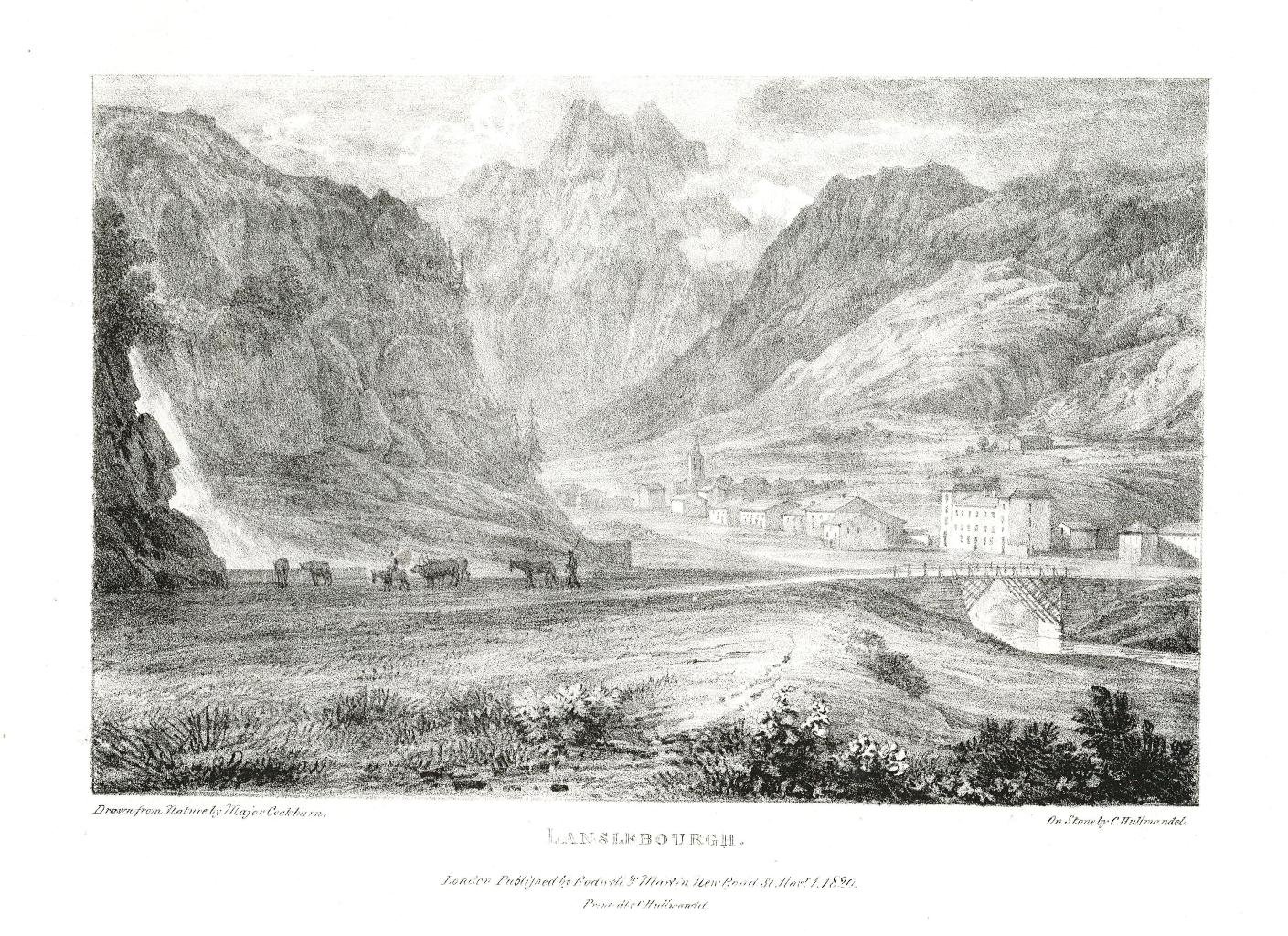 Litografia, antica ed originale, raffigurante la veduta panoramica della valle e del villaggio. Inserita nell'opera "Views to illustrate the route of Monte Cenis, drawn from nature by Major Cockburn" pubblicata a Londra da Rodwell & Martin nel 1822, illustrata da cinquanta litografie su disegno di James Pattison Cockburn e litografate da C. Hullmandel. In perfette condizioni con ampi margini