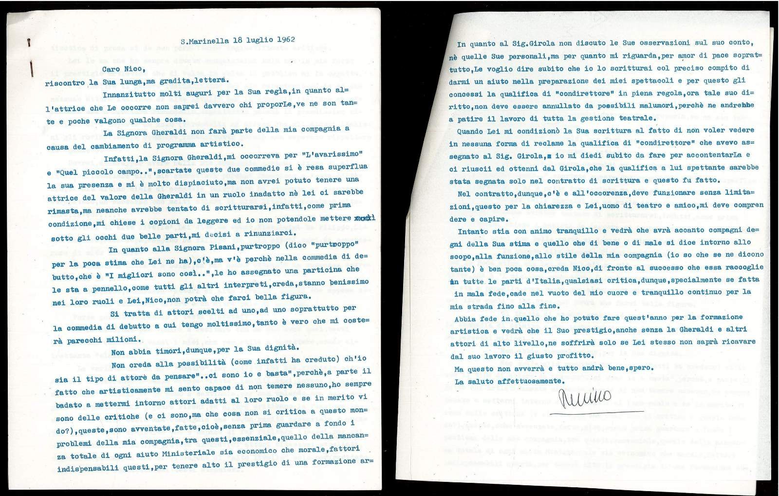 Lettera dattiloscritta, di 4 pagine, datata 18 luglio 1962 di Peppino de Filippo il quale scrive a Nico Pepe (nativo di Udine) che non ha in mente un’attrice da suggerirgli per una commedia di cui deve curare la regia. De Filippo si lamenta del mancato sostegno economico alla sua compagnia e al teatro in generale da parte delle istituzioni. Sottolinea quanto sia difficile formare una compagnia teatrale ed esprime il suo disappunto nei confronti della spocchia degli attori italiani che privilegiano le commedie straniere a quelle italiane e preferiscono comunque esibirsi in TV o al cinema. Infine, spiega a Pepe perché ha nominato il Sig. Girola come suo condirettore poiché, dal tono della lettera, sembrerebbe che il collega e amico non abbia approvato questa scelta. Vengono nominati, tra gli altri, Luigi Pirandello e Lidia Maresca, compagna di de Filippo. La lettera, tenuta insieme con uno spillo, presenta note a biro e firma autografa dell’autore, pure a biro.