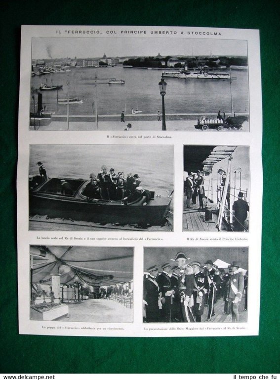Rara Stampa Estratta da Rivista d'epoca del 1922 Nel 1922 Il "Ferruccio" col Principe Umberto a Stoccolma. Il "Ferruccio" entra nel porto di Stoccolma la lancia reale col Re di Svezia e il suo seguito attacca al barcarizzo del "Ferruccio" il Re di Svezia saluta il Principe Umberto la poppa del "Ferruccio" addobbata per un ricevimento la presentazione dello Stato Maggiore del "Ferruccio" al Re di Svezia + La città di Smirne incendiata e distrutta. Smirne: il convento e la chiesa dei Padri Domenicani la scuola italiana di Smirne II1922-015 Dimensioni Cm 25,00 x 33,00 + 25,00 x 18,00 Qualora vogliate delle scansioni migliori contattateci, soddisferemo ogni vostra richiesta. PaypalCarta di creditoBonifico bancario Accuratamente adagiate su un cartoncino e protette da pellicola trasparente rigida,il tutto viene inserito dentro plico di adeguate dimensioni per proteggerne l'integrità.