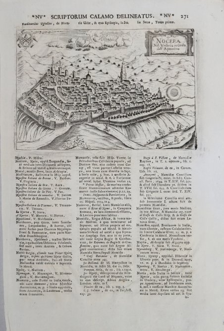 Veduta della città, edita per la prima volta nel 1599 nel "Theatrum Urbium Italicarum", serie di 59 tavole con vedute e piante accompagnate da descrizione latina, eseguite da più incisori, poi ristampata, accresciuta, anche con il titolo italiano Teatro delle città d’Italia, per i tipi di Domenico Amadio.Alla morte di Pietro , l’attività proseguì con suo figlio Francesco, anch’egli tipografo, incisore e editore. Il "Teatro delle città d’Italia" venne più volte ristampato e implementato da Francesco nel corso del secolosuccessivo. Questo esemplare è tratto dall'opera ' Universus terrarum orbis scriptorum calamo delineatus . qui de Europae, Asiae, Africae, & Americae regnis, provinciis, populis, civitatibus. pubblicata a Padova nel 1713, presso Matteo Cadorin, da Raffaello Savonarola, sotto lo pseudonimo di Lasor a Varea (o Varela). L'opera era una sorta di enciclopedia che conteneva notizie sulle varie località del mondo disposte in ordine alfabetico, arricchita da mappe e vedute di tutto il mondo che appartengono a celebri raccolte cartografiche del passato – Bertelli, Valegio, Camocio, Bonifacio, Nelli, Magini e altri – del quale probabilmente l’editore Cadorin era in possesso delle matrici originali. Incisione su rame, ampi margini, in ottimo stato di conservazione. This example is taken from the work ' Universus terrarum orbis scriptorum calamo delineatus . qui de Europae, Asiae, Africae, & Americae regnis, provinciis, populis, civitatibus. ' published in Padua in 1713, at Matteo Cadorin, by Raffaello Savonarola, under the pseudonym of Lasor a Varea (or Varela). The work was a kind of encyclopedia containing news about the various localities of the world arranged in alphabetical order, enriched with maps and views of the whole world belonging to famous cartographic collections of the past-Bertelli, Valegio, Camocio, Bonifacio, Nelli, Magini, and others-of which the publisher Cadorin probably possessed the original plates. Copper engraving, in excellent condition. Cfr.