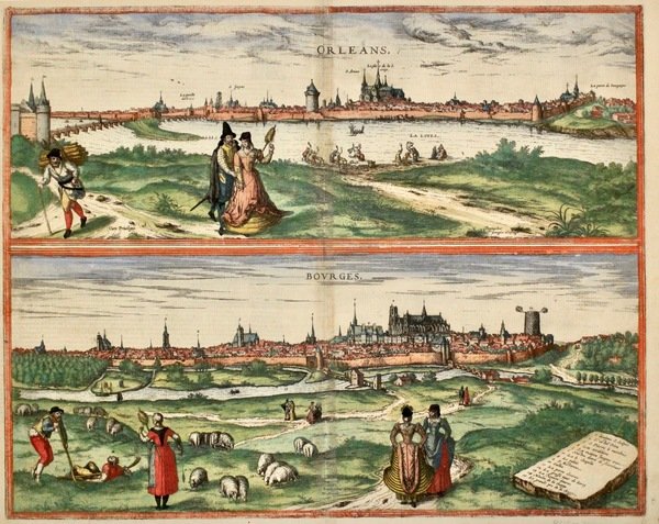 Incisione in rame, mm 370x470, colorata d'epoca. Due belle vedute delle città francesi, tratte da "Civitates Orbis Terrarum", pietra miliare del vedutismo, pubblicata in anni differenti dal 1572 al 1615 ca. in 6 volumi. Interessante anche la rappresentazione in primo piano di alcuni personaggi di varie condizioni sociali con i relativi indumenti e occupazioni. Georg Braun (1541-1622) è stato un erudito teologo che compì numerosi viaggi per scopi religiosi e politici nei quali ebbe modo di raccogliere un vasto materiale antropologico e geografico. Franz Hogenberg (1540 ca - 1590 ca) fu un abile incisore fiammingo. Dopo aver collaborato con Ortelio per il "Theatrum Orbis Terrarum", bandito dai Paesi Bassi, si trasferì a Colonia, dove continuò la sua attività di incisore. I due collaborarono per alcuni anni dando alla luce la loro più celebre opera, il "Civitates Orbis Terrarum". Ottimo esemplare con leggero ingiallimento lungo la piega centrale.