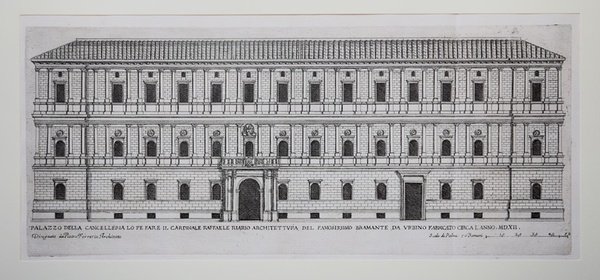 Palazzo della Cancelleria lo fece fare il cardinale Raffaele Riario architettura del famosissimo Bramante da Ubrnino fabrica | Gravures | FERRERIO Pietro