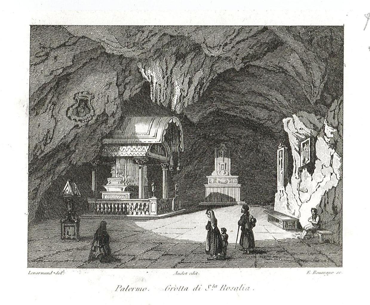 Stampa, antica ed originale, con piccola veduta dell'interno della grotta di santa Rosalia. Autore: Audot edit. Luogo: Palermo. Anno: 1838. Tecnica: incisione in acciaio. Dimensioni: 78x100. La veduta è inserita nell’opera "Italie, la Sicile, les Isles Eoliennes, l’Ile d’Elbe, la Sardaigne, Malte…Recuillis… da Audot padre", pubblicata a Parigi presso Audot Fils nel 1834-[1837]. La stessa incisione è inserita nell’opera "L’Italia, le Sicilie, le Isole Eolie, l’Isola d’Elba, la Sardegna…raccolti e pubblicati da Audot padre, membro della Società di Geografia", stampata a Torino presso Giuseppe Pomba & C. nel 1834-[1838]