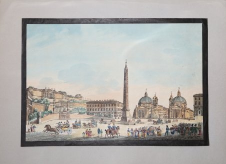 Rara e deliziosa veduta di piazza del Popolo, sapientemente delineata da Antonio Acquaroni, dalla parte di porta Flaminia, che abbraccia il panorama dalla nota terrazza del Pincio a via di Ripetta. La rappresentazione è dinamica, sono raffigurati diversi tipi di carrozze, ben distribuite nello spazio semicircolare; a destra, una vivace scene di folklore di balli a suon di tamburelli. Tra gli attenti spettatori adunati, anche due guardie in uniforme, rappresentati di spalle in atteggiamento di riposo. Lo spettacolo richiama l'attenzione di una delle due guardie a cavallo, rivolto di profilo verso il gruppo, mentre un venditore ambulante vende qualcosa ad uomo con una bambina. Nel resto della piazza, diverse persone passeggiano coi loro eleganti abiti, sullo sfondo di distinguono anche due chierici e, più indietro, un uomo tira faticosmente il suo asino. Le sfumature del cielo collocano la scena nelle ore pomeridiane. Rara e deliziosa veduta di piazza del Popolo, sapientemente delineata da Antonio Acquaroni, dalla parte di porta Flaminia, che abbraccia il panorama dalla nota terrazza del Pincio a via di Ripetta. La rappresentazione è dinamica, sono raffigurati diversi tipi di carrozze, ben distribuite nello spazio semicircolare; a destra, una vivace scene di folklore di balli a suon di tamburelli. Tra gli attenti spettatori adunati, anche due guardie in uniforme, rappresentati di spalle in atteggiamento di riposo. Lo spettacolo richiama l'attenzione di una delle due guardie a cavallo, rivolto di profilo verso il gruppo, mentre un venditore ambulante vende qualcosa ad uomo con una bambina. Nel resto della piazza, diverse persone passeggiano coi loro eleganti abiti, sullo sfondo di distinguono anche due chierici e, più indietro, un uomo tira faticosmente il suo asino. Le sfumature del cielo collocano la scena nelle ore pomeridiane. Cfr.