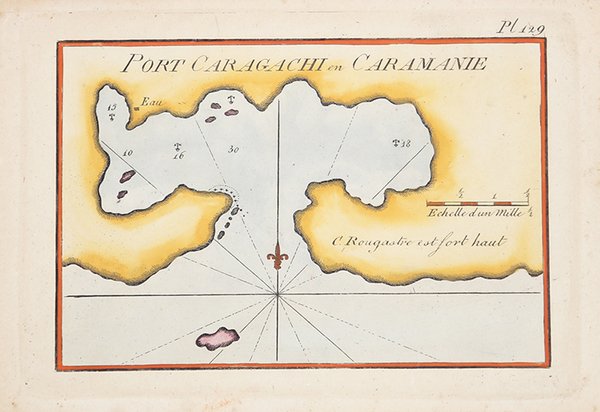Piano nautico tratto dal " Recueil des principaux plans des ports & rades de la Méditerranée" di Josepgh Roux, pubblicato per la prima volta a Marsiglia nel 1764 e successivamente ristampato - ampliato - a Genova da Yves Gravier con il titolo "Recueil de 163 principaux plans des ports et rades de la Mediterranée" (1804).Ulteriore edizione dell'opera, con il titolo "Plans des ports ed des rades de la Mer Méditerranée." è stampata a Livorno da Carlo Tesi nel 1858. Incisione in rame, finemente acquarellata a mano, in ottimo stato di conservazione. First published in the "Recueil des principaux plans des ports et rades de la Mer Mediterranee", 1764, this nice nautical chart is taken from the rare "Plans des ports ed des rades de la Mer Méditerranée." published in Leghorn by Carlo Tesi, 1858. Copperplate with fine colouring, in very good condition. Cfr.