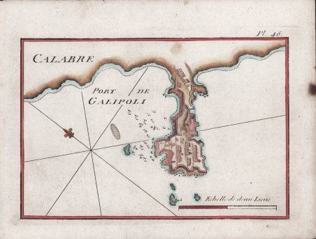 Piano nautico del porto di Gallipoli tratto dal celebre ' Recueil des principaux plans des ports et rades de la mer méditerranée estraits de ma carte en douze feuilles, dédiée à Monseigneur le Duc de Choiseul ministre de la guerre et de la marine. ' Par son très humble serviteur Joseph Roux, hydrographe du roy. A Genes chez Yves Gravier Libraire sous la Loge de Banchi. 1779. Seconda edizione, accresciuta, di questa celebre raccolta di piani nautici del Mediterraneo, completa di 123 incisioni in rame che mostrano le piante dei principali porti o rade del Mediterraneo, con scandagli, possibili ancoraggi, la natura dei fondali, così come le città, fortificazioni, cittadelle, arsenali e fari ad essi collegati. Ogni mappa ha una scala in leghe, ' toises ' o miglia di Provenza. Questa importante raccolta, la più completa e precisa per la sua epoca, è dovuta a Joseph Roux. I Roux di Marsiglia erano una famiglia di idrografi e pittori specializzati in ritratti di uomini di mare e navi. Joseph Roux nacque nel 1725, da Joseph Roux l'Ancien (1682-1742), che lavorava come idrografo, e Magdaleine Senequier. Fu suo padre che aprì un negozio idrografico nel porto di Marsiglia nel 1708, sotto l’insegna ' La Boussole Couronnée. ' Joseph Roux le Jeune, è conosciuto come l'inventore del genere del ritratto di nave, un genere che fu perfezionato dalle tre generazioni successive. Si dedicò subito all’attività di famiglia, diventando idrografo come suo padre, producendo, pubblicando e vendendo un vasto assortimento di carte nautiche e strumenti di navigazione. Intorno alla metà del secolo, ricevette l’onorificenza di ' Hidrographe du Roy ' e, nel 1764, pubblicò una serie di 12 carte del Mediterraneo, un atlante nautico che venne usato per un certo numero di anni, persino sulle navi inglesi. Contemporaneamente, pubblicò la prima edizione – che comprendeva 65 tavole di formato tascabile – del ' Recueil des principaux plans des ports et rades de la mer méditerranée ' (Marsiglia 1764), successivamente ristampato - ampliato - a Genova da Yves Gravier nel 1779 e infine, con il titolo ' Recueil de 163 principaux plans des ports et rades ' de la Mediterranée, ' nel 1804. Per tutto il XIX secolo, seguirono svariate edizioni, alcune ampliate, sia in Francia sia in Italia. Alcune a cura dello stesso Roux, mentre altre erano copie non autorizzate. Acquaforte, in ottimo stato di conservazione. Bibliografia National Maritime Museum, III, n. 269; cfr. P. C. F. Smith, ' The Artful Roux: Marine Painters of Marseille, Peabody Museum of Salem, 1978; Nordenskiöld 254. Piano nautico del porto di Gallipoli tratto dal celebre ' Recueil des principaux plans des ports et rades de la mer méditerranée estraits de ma carte en douze feuilles, dédiée à Monseigneur le Duc de Choiseul ministre de la guerre et de la marine. ' Par son très humble serviteur Joseph Roux, hydrographe du roy. A Genes chez Yves Gravier Libraire sous la Loge de Banchi. 1779. Seconda edizione, accresciuta, di questa celebre raccolta di piani nautici del Mediterraneo, completa di 123 incisioni in rame che mostrano le piante dei principali porti o rade del Mediterraneo, con scandagli, possibili ancoraggi, la natura dei fondali, così come le città, fortificazioni, cittadelle, arsenali e fari ad essi collegati. Ogni mappa ha una scala in leghe, ' toises ' o miglia di Provenza. Questa importante raccolta, la più completa e precisa per la sua epoca, è dovuta a Joseph Roux. I Roux di Marsiglia erano una famiglia di idrografi e pittori specializzati in ritratti di uomini di mare e navi. Joseph Roux nacque nel 1725, da Joseph Roux l'Ancien (1682-1742), che lavorava come idrografo, e Magdaleine Senequier. Fu suo padre che aprì un negozio idrografico nel porto di Marsiglia nel 1708, sotto l’insegna ' La Boussole Couronnée. ' Joseph Roux le Jeune, è conosciuto come l'inventore del genere del ritratto di nave, un genere che fu perfezionato dalle tre generazioni successive. Si dedicò subito all’attività di famiglia, diventando idrografo come suo padre, producendo, pubblicando e vendendo un vasto assortimento di carte nautiche e strumenti di navigazione. Intorno alla metà del secolo, ricevette l’onorificenza di ' Hidrographe du Roy ' e, nel 1764, pubblicò una serie di 12 carte del Mediterraneo, un atlante nautico che venne usato per un certo numero di anni, persino sulle navi inglesi. Contemporaneamente, pubblicò la prima edizione – che comprendeva 65 tavole di formato tascabile – del ' Recueil des principaux plans des ports et rades de la mer méditerranée ' (Marsiglia 1764), successivamente ristampato - ampliato - a Genova da Yves Gravier nel 1779 e infine, con il titolo ' Recueil de 163 principaux plans des ports et rades ' de la Mediterranée, ' nel 1804. Per tutto il XIX secolo, seguirono svariate edizioni, alcune ampliate, sia in Francia sia in Italia. Alcune a cura dello stesso Roux, mentre altre erano copie non autorizzate. Acquaforte, in ottimo stato di conservazione. Bibliografia National Maritime Museum, III, n. 269; cfr. P. C. F. Smith, ' The Artful Roux: Marine Painters of Marseille, Peabody Museum of Salem, 1978; Nordenskiöld 254. Cfr.