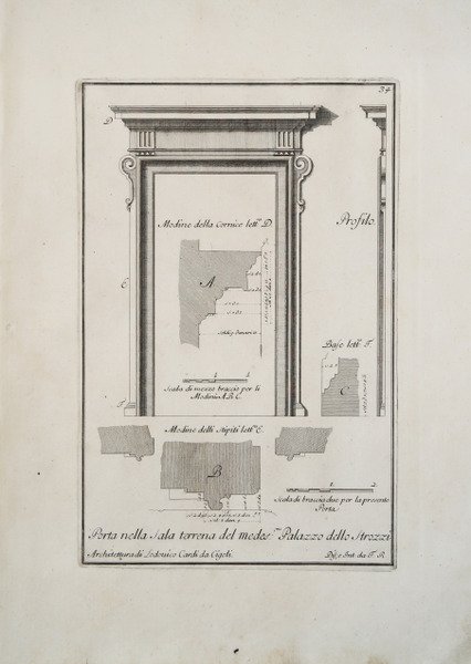 Tavola architettonica tratta dal celebre ' Studio d'architettura civile delle fabbriche più insigni di Firenze ' di Ferdinando Ruggieri, pubblicato a Firenze tra il 1722 e il 1728. Ruggieri, architetto ed incisore, è esponente significativo del primo Settecento fiorentino. ' ' Nel 1717 il suo nome appare nell’elenco dei contributori dell’Accademia del disegno di Firenze, le cui tasse continuò a versare fino al 1740, mentre risulta immatricolato dal 1720. Dietro suggerimento dell’abate Bottari – come quest’ultimo scriveva in una lettera del 1764 a Giovanni Pietro Zanotti –, nel 1718 fu avviata l’impresa editoriale dello ' Studio d’architettura civile, una raccolta di particolari architettonici da palazzi e fabbriche esemplari di Firenze. Fu pubblicato in tre volumi in folio presso la Stamperia Reale rispettivamente nel 1722, nel 1724 e nel 1728; un quarto volume, annunciato nella prefazione al primo, non fu composto. L’operazione editoriale maturò quando era ormai certa l’estinzione della dinastia medicea e nei tre volumi (rispettivamente dedicati al granduca Cosimo III, al granduca Gian Gastone e a Maria Luisa, elettrice palatina, ultima rappresentante della famiglia) si celebra la secolare attività di mecenati a partire da Cosimo il Vecchio con Filippo Brunelleschi e Lorenzo il Magnifico con Michelangelo Buonarroti. L’approccio ‘scientifico’ al lavoro è ricordato dallo stesso Ruggieri, che sottolinea il controllo totale avuto sulle varie fasi essendo egli stato rilevatore, disegnatore, incisore e responsabile delle scelte critiche delle architetture da presentare. (cfr. Oronzo Brunetti - Dizionario Biografico degli Italiani - Volume 89). Incisione in rame, stampata su carta vergata coeva, con margini, in ottimo stato di conservazione. Architectural plate from Ferdinando Ruggieri's famous ' Studio d'architettura civile delle fabbriche più insigni di Firenze, ' published in Florence between 1722 and 1728. Ruggieri was an architect and engraver, a significant exponent of early 18th-century Florence. In 1717 his name appears in the list of contributors to the “Accademia del disegno” in Florence, whose fees he continued to pay until 1740, while he is registered from 1720. At the suggestion of Abbot Bottari ' ' the publishing venture of the ' Studio d'architettura civile, a collection of architectural details from exemplary palaces and factories in Florence, was begun in 1718. It was published in three folio volumes at the Stamperia Reale in 1722, 1724 and 1728 respectively; a fourth volume, announced in the preface to the first, was not composed. The publishing operation matured when the extinction of the Medici dynasty was certain, and the three volumes (respectively dedicated to Grand Duke Cosimo III, Grand Duke Gian Gastone and Maria Luisa, electress palatine, the last representative of the family) celebrate the centuries-long patronage activities starting with Cosimo the Elder with Filippo Brunelleschi and Lorenzo the Magnificent with Michelangelo Buonarroti. The 'scientific' approach to the work is recalled by Ruggieri himself, who emphasizes the total control he had over the various stages having been surveyor, draughtsman, engraver and responsible for the critical choices of the architectures to be presented. Copperplate, printed on contemporary laid paper, with margins, good condition. Cfr.