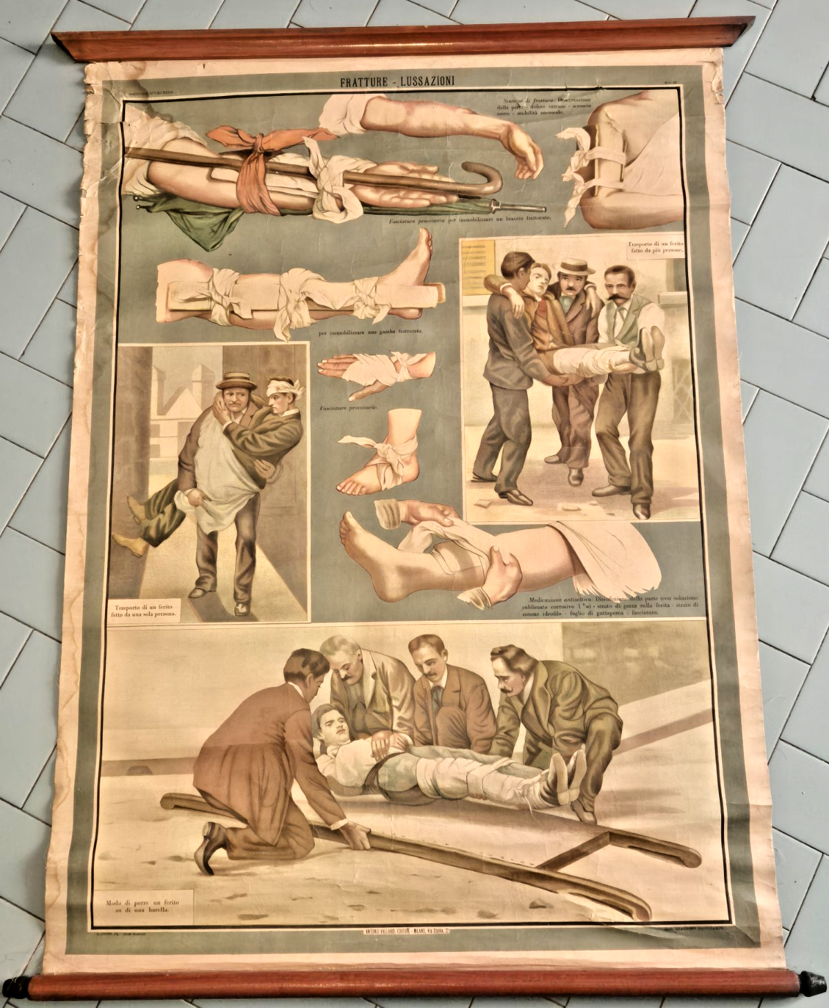 Poster didattico scolastico o tavola parietale "Fratture, lussazioni" edito dalla Vallardi presumibilmente negli anni '20 del '900.