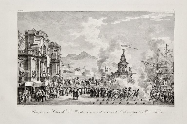 Procession du Char de S. Rosalie à son entrée dans le Cassoro par la Porta Felice
