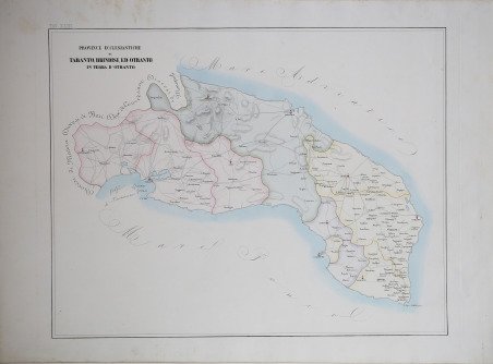 Carta geografica raffigurante le legazioni ecclesiastiche della regione, tratta dall’Orbe Cattolico ' di Girolamo Petri. L'Orbe Cattolico ossia Atlante Geografico Storico Ecclesiastico ' fu pubblicato a Roma in 3 volumi nel 1858-1859. Le mappe di grande formato sono finemente incise e ben colorate. È senza dubbio una delle opere più finemente incise ed eleganti della metà del XIX secolo. Ogni mappa mostra le varie diocesi, ognuna delle quali è contraddistinta da colori vivaci che ne segnano la sede, e altre città importanti. Sebbene le caratteristiche geografiche siano chiaramente espresse, le mappe sono volutamente piuttosto scarne di dettagli, in modo da non sminuire visivamente il loro scopo, che è quello di mostrare le divisioni ecclesiastiche. Nel creare l'atlante, Petri ha sottolineato di aver attinto solo alle "fonti più attendibili", comprese le mappe degli archivi vaticani e delle diocesi d'oltremare L'atlante fu pubblicato in un numero molto limitato di esemplari ad uso esclusivo dei cardinali e degli amministratori di alto rango, il che ne spiega la grande rarità odierna. Girolamo Petri (1806 - 1871) fu una figura importante nell'amministrazione della Chiesa cattolica romana durante il regno di Pio IX. Nacque a Onano (Viterbo, Lazio), figlio di un funzionario vaticano che in seguito divenne governatore di Frascati. Il lavoro di Petri fu svolto in un periodo in cui la Chiesa era sotto assedio in Europa, ma, al contrario, aveva grandi ambizioni di espansione all'estero, in particolare in Asia e in Africa. La metà del XIX secolo fu un periodo di grandi cambiamenti a Roma. L'atlante faceva senza dubbio parte degli ultimi sforzi del Vaticano per comprendere e controllare la sua vasta influenza in tutto il mondo, resuscitando il concetto popolare di province ecclesiastiche diffuso nelle opere di Nicolas Sanson e altri cartografi del XVII secolo. La Calcografia Nazionale (Istituto per la Grafica) conserva ancora 135 rami di questo rarissimo atlante. Incisione in rame, coloritura coeva, in ottimo stato di conservazione. Bibliografia Walter Goffart, ' Historical Atlases: The First Three Hundred Years, 1570-1870 ' (Chicago, 2003), p. 427-8; J.A.B. Jongeneel, ' Philosophy, Science, and Theology of Mission in the 19th and 20th Centuries: A Missiological Encyclopedia ' (1995), p. 264. A very rare map showing the dioceses of Catholic organization, taken from ' L'Orbe Cattolico ' by Girolamo Petri. L’Orbe Cattolico ossia Atlante Geografico Storico Ecclesiastico’ ' was published in Rome in 3 volumes in 1858-1859. ' The large-format maps are finely engraved and beautifully colored. The atlas is a testament to the artistry of the engravers and the relative indifference of the publisher to the commercial success of the work. It is without question one of the most finely engraved and elegant works of the mid-19th Century. Each map shows the various dioceses, which are each distinguished by their own bright colors, marking their seats, as well as other major towns. While key geographical features are expressed throughout, the maps are otherwise intentionally rather sparing of detail, so as not to visually detract from their purpose, which is the show the ecclesiastical divisions. In creating the atlas, Petri noted that he drew only upon the “most trusted sources”, including maps from the Vatican archives and overseas dioceses. The atlas was by far and away the finest ecclesiastical atlas created during the 19th Century, featuring exceptionally beautiful examples of thematic cartography. The uncommonly beautiful atlas was published in only a very small number of examples for the exclusive use of Cardinals and high-ranking administrators, accounting for the great rarity today. Petri who was commissioned by Pope Pius XI thus created during a time when the Church was under siege within Europe, but, conversely, while it had major ambitions for expansion overseas, particularly in Asia and Africa. The mid-19th Century was a period of dramatic change in Rome. The atlas was no doubt part of the Vatican's last-ditch efforts to understand and control its vast influence around the world, resurrecting the popular concept of ecclesiastical provinces popularized in works by Nicholas Sanson and others during the 17th Century. The Calcografia Nazionale still preserves 135 copperplates of this extremely rare atlas. Bibliografia Walter Goffart, ' Historical Atlases: The First Three Hundred Years, 1570-1870 ' (Chicago, 2003), p. 427-8; J.A.B. Jongeneel, ' Philosophy, Science, and Theology of Mission in the 19th and 20th Centuries: A Missiological Encyclopedia ' (1995), p. 264. Cfr.