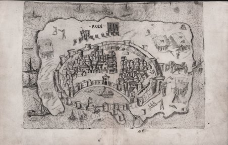 Carta geografica dell’isola di Rodi. In alto all’interno dell’isola il titolo RODI. Mappa priva di scala grafica, orientazione e graduazione ai margini.Questa mappa dell’isola di Rodi ha radici ancora sconosciute, si tratta di una mappa abbastanza chiara della città all’epoca dell’assedio del sultano Solimano, quando i cavalieri di San Giovanni intervennero per liberarla. Ben tracciata è la fortificazione del porto che circonda la città; la scena riportata sul lato destro della mappa, con grande probabilità vuole raffigurare i cavalieri di San Giovanni che trasportano il corpo di Sant’Eufemia ed altri valori dell’Ordine a bordo di una nave. La stampa, tuttavia, non è coeva alle scene rappresentate e può essere attribuita, senza grandi dubbi, alla mano di Ferrando Bertelli. L’unico esemplare conosciuto di questa carta è quello descritto da Peter Meurer nello ‘Strabo Atlas’, atlante appartenuto alla famiglia Bertelli, ora conservato alla Bayerische StaatsBibliothek di Monaco di Baviera.Acquaforte e bulino, in buono stato di conservazione. Map of Rhodes, lettered RODI within the map at top. Without graphic scale.The only one example known is described by Peter Meurer in "The Strabo Illustratus Altlas": "The publishing background of this hitherto unrecorded map awaits further research. The view of the town of Rodhes is rather good, see details like the chain closing the strongly fortified harbour. The outlines of the island are only sketchy. Some group of figures seem to allude to the evnts of 1 January 1523, when the Knights of St. John honourably surrendered Rhodes to Sultan Solyman after a long siege. The scenary on the right coast probably shows the knights bringing teh body of Saint Euphemia and other valuables of the Order on board of a ship."This engraving is however not contemporary to the scenes, and can be attribued to Ferrando Bertelli.The Strabo atlas, came from the House of Bertelli in Venice, is kept by Bayerische StaatsBibliothek - Bavarian State Library.Copperplate, in good condition. Cfr. Meurer (2002): n. 133.