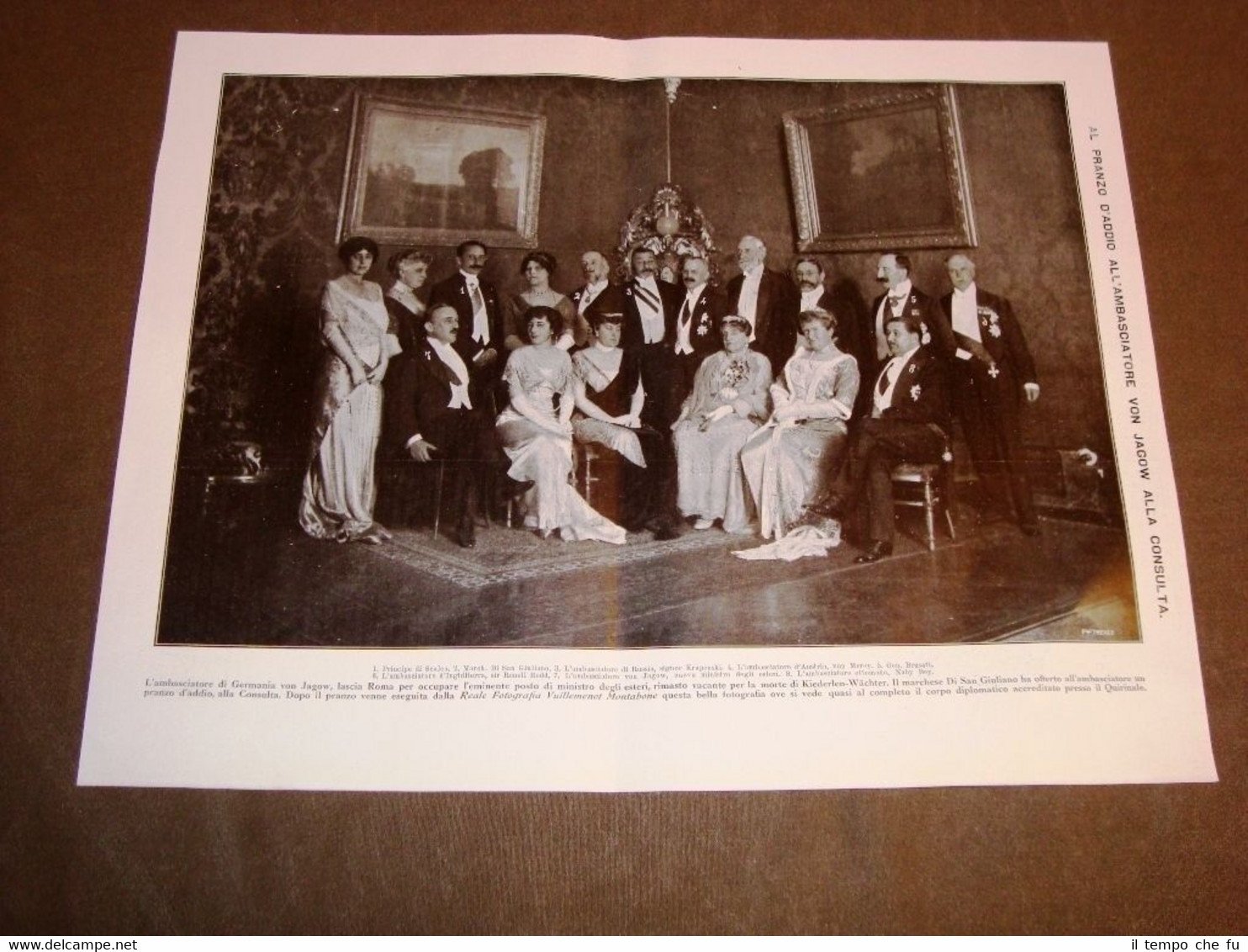 Rara stampa Estratta da Rivista d'epoca del 1913 . .stampa che ha quindi oltre 101 anni! Roma nel 1913 Il pranzo d'addio offerto dal Marchese di San Giuliano all'Ambasciatore di Germania Von Jagow che diventa ministro degli esteri dopo la morte di Kiederlen - Wachter Principe di Scalea, Marchese di San Giuliano, Ambasciatore di Russia Krupenski, Ambasciatore d'Austria Von Merey, Generale Brusati, Ambasciatore d'Inghilterra Renell Rodd, Von Jagow, Ambasciatore ottomano Naby Bey Foto del corpo diplomatico ad opera della Reale Fotografia Vuillemenot Montabone II1913-011 Dimensioni Cm 36,00 x 29,00 Qualora vogliate delle scansioni migliori contattateci, soddisferemo ogni vostra richiesta. PaypalCarta di creditoBonifico bancario Accuratamente adagiate su un cartoncino e protette da pellicola trasparente rigida,il tutto viene inserito dentro plico di adeguate dimensioni per proteggerne l'integrità.
