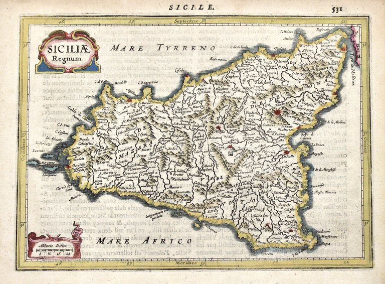 Incisione in rame, mm 148x192, colorata a mano. Tratta dall'edizione francese del "Atlas Minor" di Hondius, pubblicato nel 1606 per la prima volta dopo l'acquisto, da parte del costruttore di globi Hondius, delle lastre di Mercatore con l'aggiunta di lastre originali di propria creazione. Buon esemplare.<BR>