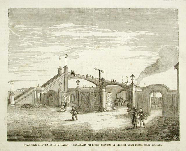 Stampa, antica ed originale, raffigurante il cavalcavia pedonale, nella stazione merci, presso Porta Garibaldi. Inserita in una rara pubblicazione, edita dall'Editore Edoardo Sonzogno, spesso non inserita nelle bibliografie di riferimento. Testo al retro