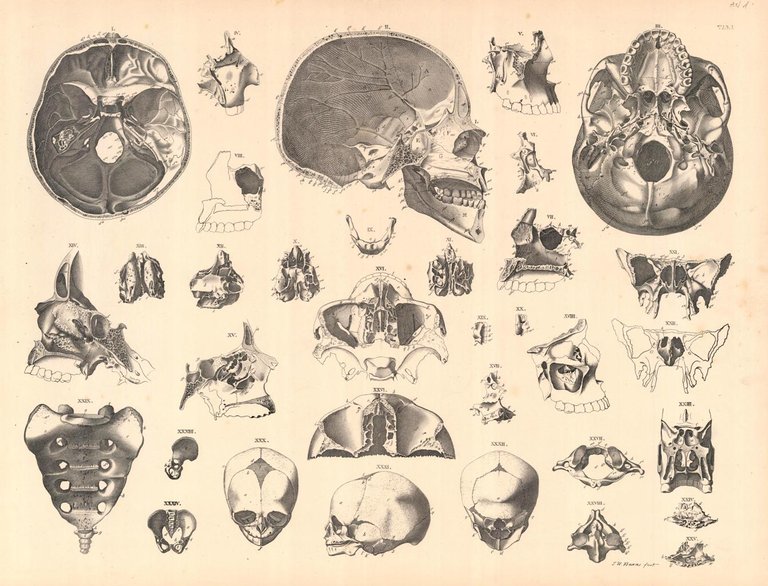 Rappresentazione degli organi a grandezza naturale del corpo umano. Moritz Ignaz Weber (1795-1875) fu stimato Professore di Anatomia Comparata e Patologica. Spese tutta la sua vita nel campo dell'anatomia e delle scienze associate pubblicando numerosi studi. L’Anatomischer Atlas, che raffigura il corpo umano in 84 tavole litografiche a grandezza naturale, è senza dubbio uno dei suoi lavori più importanti. Autore: Weber, Moritz Ignaz (1795-1875). Luogo: Anatomia. Anno: 1849. Tecnica: litografia. Dimensioni: mm 520x670 il foglio