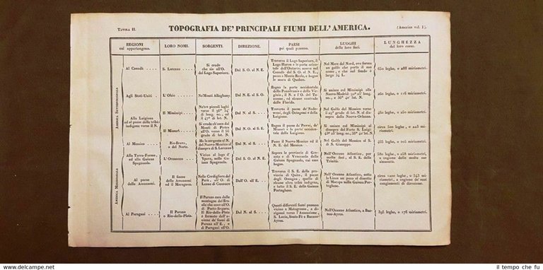 Tavola del 1830 Topografia dei principali fiumi dell'America Con l'indicazione delle regioni a cui appertengono, nomi, sorgenti, direzione, paesi in cui passano, luoghi delle loro foci e lunghezza. Codice articolo: II1878-062 Dimensioni: Cm 34,00 x 21,00 Tavola estratta dalla rarissima opera edita nel 1830 "Il costume antico e moderno, o storia del governo, della milizia, della religione, delle arti, scienze ed usanze di tutti i popoli antichi e moderni provata coi monumenti dell'antichità e rappresentata cogli analoghi disegni", di Giulio Ferrario. Giulio Ferrario (1767-1847), milanese, fu bibliotecario della Biblioteca Braidense, erudito ed autore di fortunate opere di taglio storico-letterario. La monumentale documentazione degli usi e costumi del mondo, fu compilata dal Ferrario con l'ausilio di numerosi collaboratori fu largamente apprezzata in tutta Europa nonche' piu' volte ristampata e tradotta anche fuori dai confini italiani. Un'autentica miniera di informazioni storiche, geografiche, etnologiche ed antropologiche, anche relative a parti del mondo al tempo ancora scarsamente indagate. Paypal Carta di credito Bonifico bancario Spedizione con posta ordinaria o raccomandata scelta dall'Acquirente nel momento del pagamento Clicca qui per accedere al nostro Store ed al suo sterminato archivio