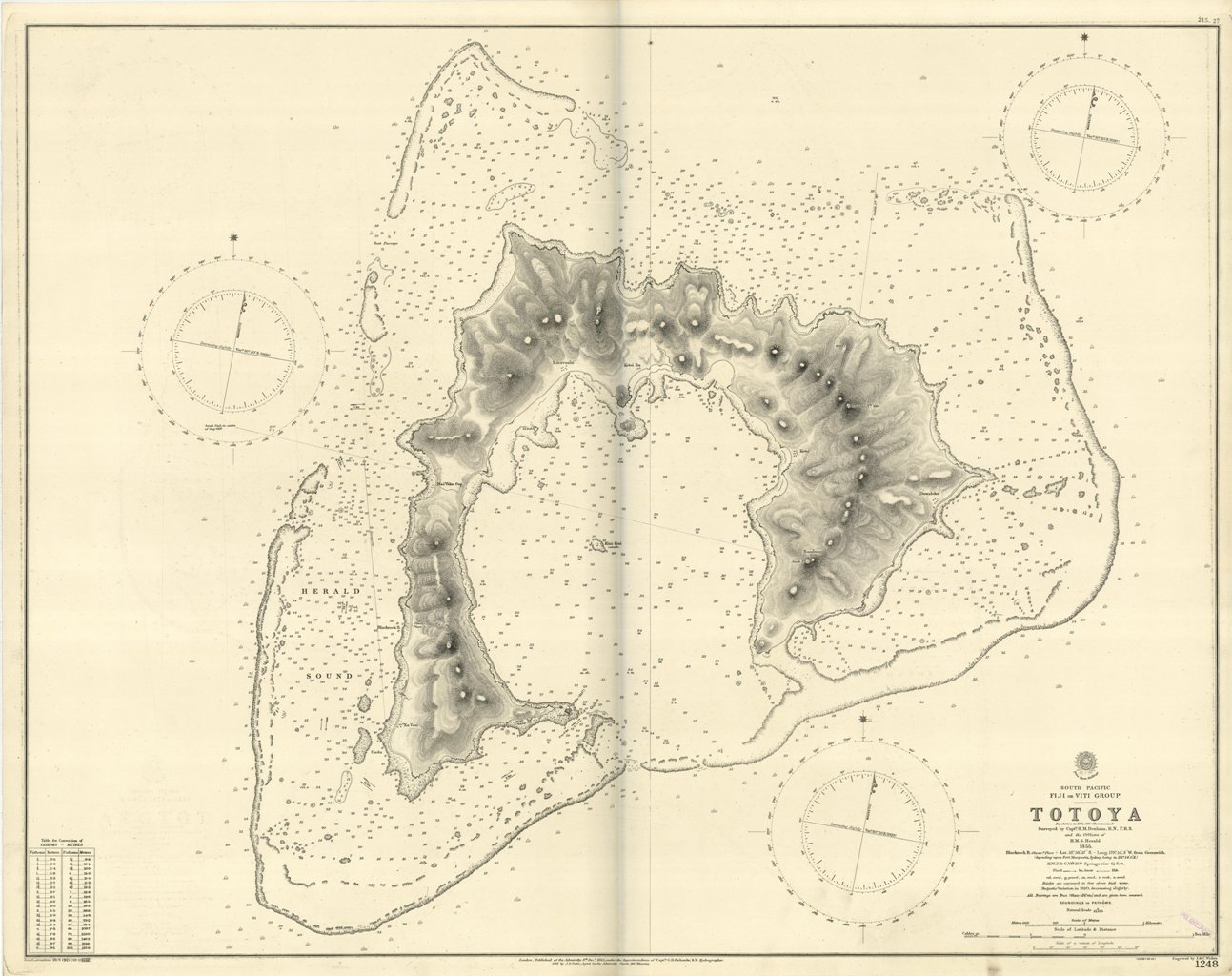 Totoya Surveyed by Capt. H.M. Denham, and the Officers of H.M.S. Herald 1855.London Published at the Admiralty, 8th Dec. 1865 under the Superintendence of Captain G.H. Richards, Hydrographer. Small corrections: 1921. Folded editorially. Autore: Admiralty Charts. Luogo: Totoya Island - Fiji Viti Group. Anno: '900. Tecnica: incisione. Dimensioni: 650x832 mm