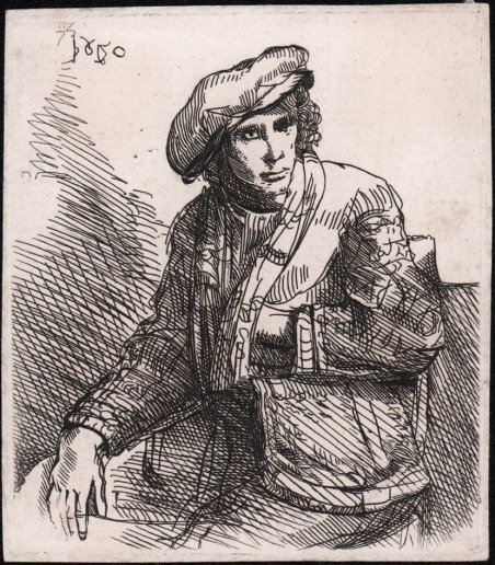 Acquaforte, datata in alto a sinistra: "1650". Stampa realizzata dalla Scuola di Rembrandt, attribuita a Constantyn Daniël van Renesse da Wurzbach e Munz, mentre White & Boon suggeriscono Barend Fabritius – un altro allievo di Rembrandt – quale auotre. Tuttavia, anche nel catalogo del British Museum rimane attribuite a Renesse. Una buona impressione, su carta vergata contemporanea, con margini sottili, ottime condizioni. Constantijn van Renesse, apparentemente, iniziò la sua carriera artistica a Leida contemporaneamente ai suoi studi all'Università. Anche se la natura della sua prima formazione artistica non è nota, ha studiato con Rembrandt van Rijn ad Amsterdam alla fine degli anni 1640 e all'inizio degli anni 1650. Un certo numero di disegni di soggetti religiosi di questo periodo sopravvivono, alcuni dei quali Rembrandt sembra aver corretto, che dimostrano l'abilità di Van Renesse di assimilare lo stile del Maestro. Van Renesse probabilmente assistette Rembrandt nell'esecuzione di una serie di dipinti religiosi su larga scala nei primi anni 1650 (vedi La discesa dalla croce). Van Renesse imparò anche a fare incisioni con chiaroscuri pronunciati durante il suo apprendistato con Rembrandt. Tra le scene di genere e i ritratti che Van Renesse incise nei primi anni 1650 c'è un autoritratto datato 1651. Bibliografia Hind 1923, A Catalogue of Rembrandt's Etchings; chronologically arranged and completely illustrated (347); White & Boon 1969; Rembrandt's Etchings: An Illustrated Critical Catalogue. p. 181, n. B 258. Etching, dated in top left corner: "1650". Print made by the School of Rembrandt, formerly attributed to Constantyn Daniël van Renesse by Wurzbach and Munz, while White & Boon suggest Barend Fabritius. However, even in the British Museum catalog it remains attributed to Renesse. A good impression, on contemporay laid paper, with thin margins, good condition. Constantijn van Renesse ' seems to have been skilled as a draughtsman, and apparently began his artistic career in Leiden simultaneously with his studies at the University. Although the nature of his early artistic training is not known, he did study with Rembrandt van Rijn (Dutch, 1606 - 1669) in Amsterdam in the late 1640s and early 1650s. A number of drawings of religious subjects from this period survive, some of which Rembrandt appears to have corrected, that demonstrate Van Renesse’s ability to assimilate Rembrandt’s style. Van Renesse probably assisted Rembrandt in the execution of a number of large-scale religious paintings in the early 1650s (see The Descent from the Cross). Van Renesse also learned to make etchings with pronounced chiaroscuro during his apprenticeship with Rembrandt. Among the genre scenes and portraits Van Renesse etched in the early 1650s is a self-portrait dated 1651. Bibliografia Hind 1923, A Catalogue of Rembrandt's Etchings; chronologically arranged and completely illustrated (347); White & Boon 1969; Rembrandt's Etchings: An Illustrated Critical Catalogue. p. 181, n. B 258. Cfr.