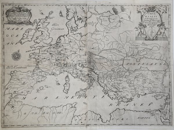 Carta geografica tratta dalla “Chorographica Descriptio Provinciarum et Conventum.”, atlante dell'ordine dei frati cappucini. L'atlante delle province cappuccine era stato iniziato in forma manoscritta dal ministro generale dell'ordine, padre Silvestro da Panicale nel 1632 e doveva servire da sussidio geografico per le visite generali. Alla sua morte il successore Padre Giovanni di Montecaliero, al quale spesso viene erroneamente attribuita la paternità delle carte, incaricò padre Massimino da Guechen di proseguire l'opera. Gli incisori delle lastre furono appunto Massimino da Guechen, Bernardino Burdigalensis e Ludovico Monteregali. L'atlante ebbe una prima edizione nel 1643 a Roma con un totale di 46 mappe (23 per l'Italia, 5 per la Spagna, 11 sulla Francia e 7 per la Germania), quindi ristampata nel 1646 ancora nella Città Eterna (Romae, et Taurini) con un numero di tavole accresciuto alle 51 definitive, compresa la grande carta geografica più volte ripiegata dell'Europa.Venne ristampata a Torino nel 1649, sumptibus Alexandri Federici Cauallerij sempre con le 51 carte geografiche definitive (l'Europa, 24 carte per l'Italia, 6 per la Spagna, 12 per la Francia e 8 per i territori dell'Impero). Infine si replicò a Torino per i torchi di Alessandro Federico Cavalleri un'ultima volta nel 1654 con le medesime carte presenti nella precedente pubblicazione. L'opera mostrava visivamente la diffusione dell'ordine, infatti le diverse carte dell'atlante, che rappresentano nazioni e province, offrono per ognuna di esse la statistica completa dei conventi. Taken from the “Chorographica Descriptio Provinciaru & Conventum F. F. Minorum S. Francisci Capucinorum.”.The atlas of the Capuchin provinces was initiated in manuscript form by the minister general of the order, Father Silvestro from Panicale in 1632 and was to serve as an aid for geographic General visits. At his death, the successor Father Giovanni from Montecaliero, which is often mistakenly attributed the authorship of maps, commissioned by his father Massimino Guechen to continue the work. The engravers of the plates were executed by Massimino from Guechen, Bernardino Burdigalensis and Ludovico Monteregali. The first edition was printed in Rome in 1643, the second in Turin in 1649 and then in 1654 and finally released in 1712, another convention attribute maps to Montecalerio. The work showed visually the spread of the order, in fact the different maps of the atlas, which represent nations and provinces, to offer each of them the full statistical convents.Copperplate, very good condition. Rare. Cfr.