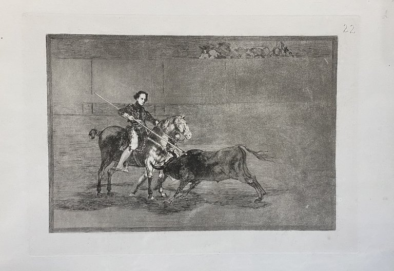 Tavola numero 22, come indica il numero inciso in alto a destra, della serie di 33 tavole nota come Tauromachia realizzata tra il 1815 e il 1816. La serie a partire dalla III edizione del 1876 raggiunge il numero di 40 tavole, sette lastre erano in effetti incise anche al verso. Sebbene la presenza delle donne nella serie sia limitata al ruolo di spettatrici, Goya in questa stampa raffigura Nicolasa Escamilla. Soprannominata La Pajuelera, fu una pioniera delle donne torero spagnole del XVIII secolo che in questa scena, con evidente coraggio, lascia avanzare il toro. Sullo sfondo, in alto a destra, un gruppo di persone osserva la scena dagli spalti. Esemplare nel III stato con il numero inciso. II edizione del 1855 riconoscibile per l'utilizzo dell'inchiostro nero e il tipo di carta, con i segni di ossidazione lungo il margine destro e le due macchie chiare nell'acquatinta a destra. Si conosce un disegno preparatorio a sanguigna, oggi conservato presso il museo del Prado n 231, nel quale La Pajuelera ha un'espressione più dolce e il pubblico è più numeroso. La lastra è in deposito presso la Calcografia Nazionale. Al verso timbro de Il Mercante di Stampe (Lugt 4722).