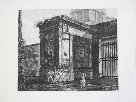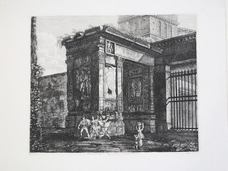 Tavola tratta dalla serie delle Antichità Romane, serie composta di 101 tavole, che viene realizzata con il ricavato della e vendita dei rami della Raccolta di cinquanta principali vedute di antichità tratte da scavi fatti in Roma in questi ultimi tempi divise in 40 vedute edita nel 1817. Con quest’opera, per il numero delle tavole e per il formato prescelto, di grandi dimensioni, l’incisore vuole affermarsi come figura di primo piano nel mondo artistico romano. In quest’opera Rossini si cimenta in un diretto confronto con il suo predecessore G. B. Piranesi che costituisce un punto di riferimento per un incisore di vedute antiche, per quanto riguarda l’originalità e l’ampiezza della riproduzione. Il Rossini, oltre a sottolineare la sua influenza nella scelta del titolo e di alcune didascalie, usa frequentemente le medesime inquadrature e identici punti di vista del maestro veneziano. Altro elemento riconducibile a Piranesi è l’uso della luce e dei forti contrasti chiaroscurali. La volontà di voler animare le vedute, restituendo il monumento al suo contesto storico e la propria inadeguatezza nel campo della figura porta Rossini ad una collaborazione con Bartolomeo Pinelli, incisore romano, interprete e illustratore del costume e della vita popolare; a cui si devono le figure e i gruppi caratteristici che corredano le vedute. Pinelli in alcuni casi, riprende i motivi tratti dalle sue precedenti raccolte di Costumi pittoreschi romani. Acquaforte, impressa su carta coeva, in buono stato di conservazione. A nice view taken from the Antichità Romane, set of 101 plates, realized with the proceeds of the sale of the plates used for Raccolta di cinquanta principali vedute di antichità tratte dai scavi fatti in Roma in questi ultimi tempi, published in 1817. This is the work with which the artist wanted to become one of the most important artists in the Roman cultural life; we can state that if we consider the size of the work and the subject he choose. In this work Rossini tested himself with his predecessor, G. B. Piranesi, who was considered as a point of reference when it came to ancient views and originality. Rossini, was deeply influenced by Piranesi, as it can be seen in the title, the legends, the same points of views and framing. Another important element he took from Piranesi is the use of light and the contrast of chiaroscuro. In these plates Rossini reached the higher mastery of the technique, realizing also extremely particular framings and a new and complex organization of the space. In the plates quite common is the diagonal view of the subject, which gave him the possibility to elaborate more the chiaroscuro. The will to give life to his views, the reinstatement of the monuments to their historic context and the fact that he was not good with figures, brought Rossini to start a partnership with Bartolomeo Pinelli, Roman engraver and costume illustrator of daily life. He was the one who realized the figures of Rossini’s views. Sometimes Pinelli took the subjects from his previous collection Costumi pittoreschi romani. Etching, printed on contemporary paper, good condition. Cfr. Luigi Rossini incisore. Vedute di roma 1817 - 1850, catalogo della mostra a cura di L. Gavazzi, M. E. Tottoni, Roma Palazzo Braschi, 7 aprile - 15 luglio 1982. Roma