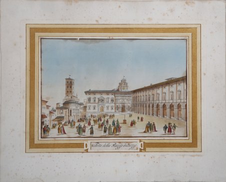 EXEMPLAR WITH COEVAL COLORING. The Viaggio pittorico della Toscana by Francesco Fontani was published for the first time in Florence by the publisher Giuseppe Tofani, between 1801 and 1803. The work is considered one of the most important and suggestive pictorial books on Tuscany, both for the graphic quality of the engravings and for the large number of places portrayed. In the three folio volumes there are 209 plates, finely etched in aquatint by the brothers Antonio and Jacopo Terreni (active in Livorno and Florence between the end of the eighteenth and the beginning of the nineteenth century), by Giovanni Pera and others. Nine of the plates in the series are printed double-page and depict the map of the region, a plan and a view of the main cities: Florence, Siena, Pisa, Livorno. All other plates are printed on single sheet and depict architecture or landscapes related to both major locations and minor centers of Tuscany. The success of Viaggio Pittorico della Toscana was remarkable, also because of the many reproductions and remakes to which most of its graphic material was subjected, in Italy and abroad. Many other books were, in fact, later illustrated with engravings deriving from the graphics of the Terreni brothers, while a second edition of the work came to light, in a reduced format, in 1817/18. ' Aquatint engraving, printed in brown ink on coeval laid paper, wide margins, very slight browning, overall in very good condition. Il Viaggio Pittorico della Toscana by Francesco Fontani, was published for the first time in Florence by the publisher Giuseppe Tofani, between 1801 and 1803. Cfr.