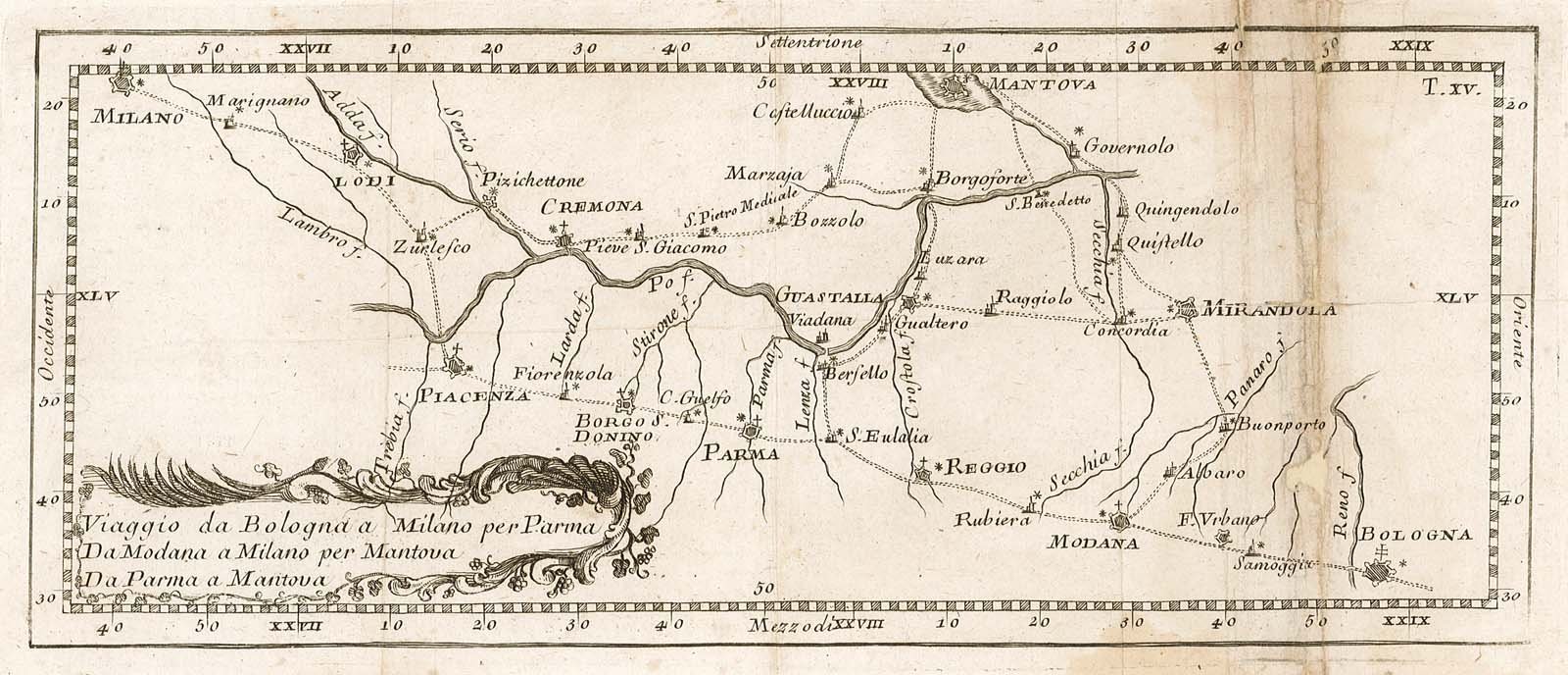 Itinerario, in prima edizione, raffigurante il percorso stradale tra le due città. Di seguito, alcune delle tappe del viaggio: Modana, Reggio, Parma, Borgo S. Donnino, Piacenza, Zurlesco, Lodi, Marignano, Pizzichettone, Cremona, Marzaia, Castelluccio, Mantova, Borgoforte, Guastalla, Governolo, Quistello, Mirandola, Buonporto, F. Urbano. Pieghe editoriali