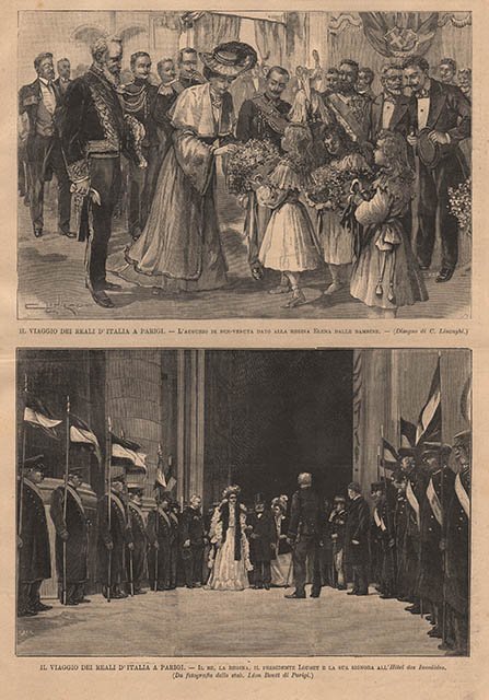 Viaggio dei reali d’Italia a Parigi - L’augurio di ben-venuta dato alla regina Elena dalle bambine - Il re, la regina, il presidente Loubet e la sua signora all’Hotel des Invalides