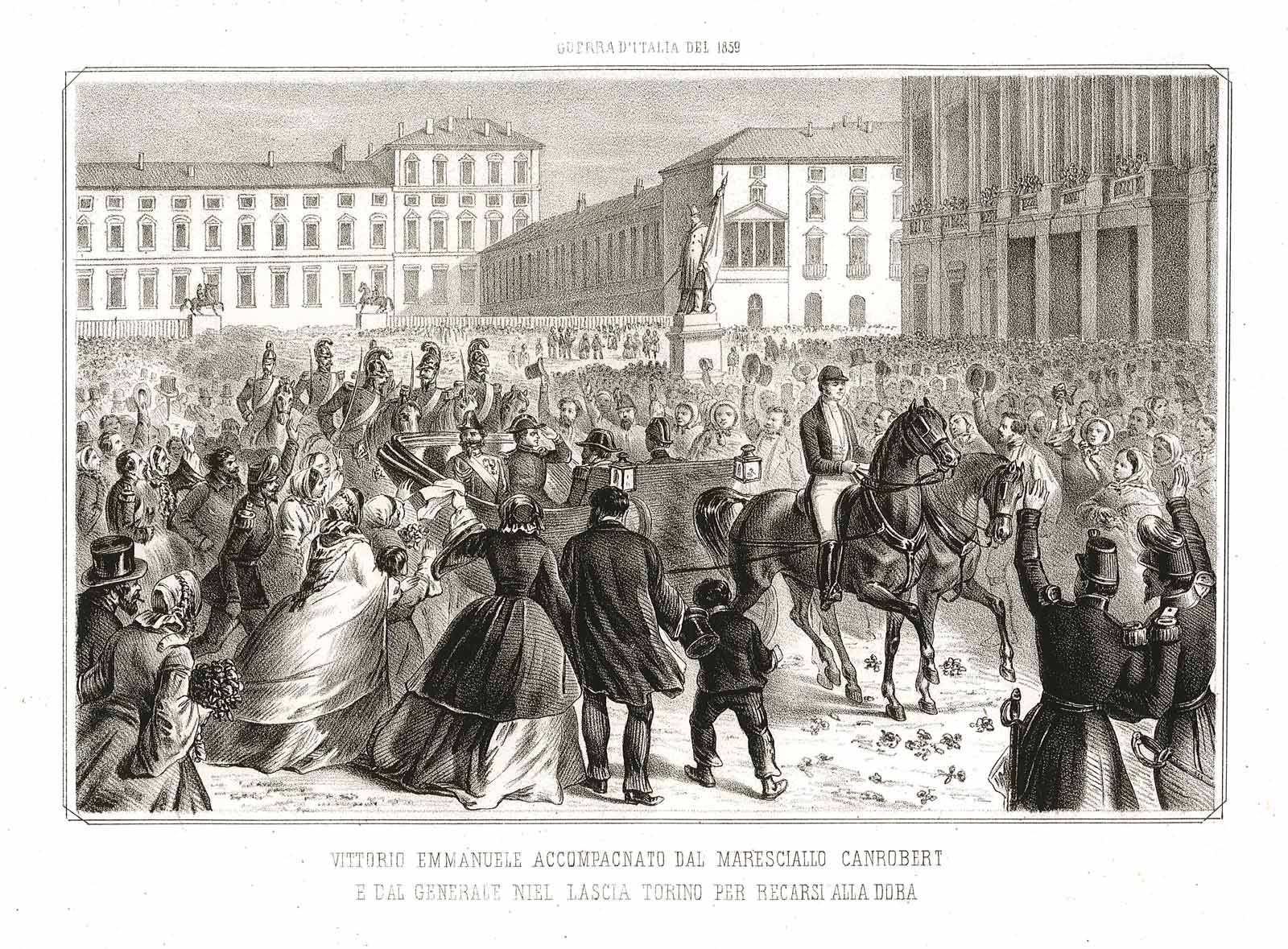 Vittorio Emmanuele accompagnato dal Maresciallo Canrobert e dal Generale Niel lascia Torino per recarsi alla Dora.