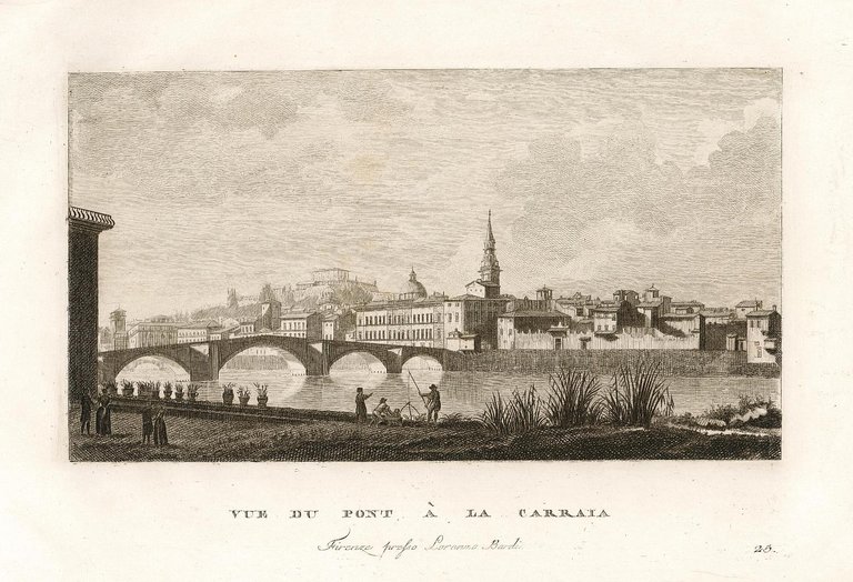 Scorcio del Ponte della Carraia cola città sullo sfondo. Stampa facente parte delle 26 vedute di Firenze incise in rame all'acquaforte da disegni di Giuseppe Zocchi ed incise da G.B. Cecchi e M. Carboni. L'incisione porta in basso il titolo in francese ed il nome dello stampatore Lorenzo Bardi in Firenze