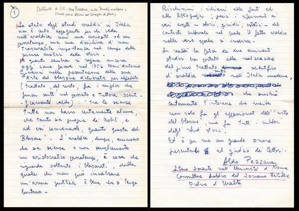 Ambasciatore Marchese Aldo Pezzana Capranica del Grillo. Cavaliere di Gran Croce con Placca d’Oro. Presidente della Commissione Araldica dell'Ordine di Malta e Gran Cancelliere dell'Ordine Costantiniano di San Giorgio. Articolo manoscritto e firmato. s.d. (anni '70).