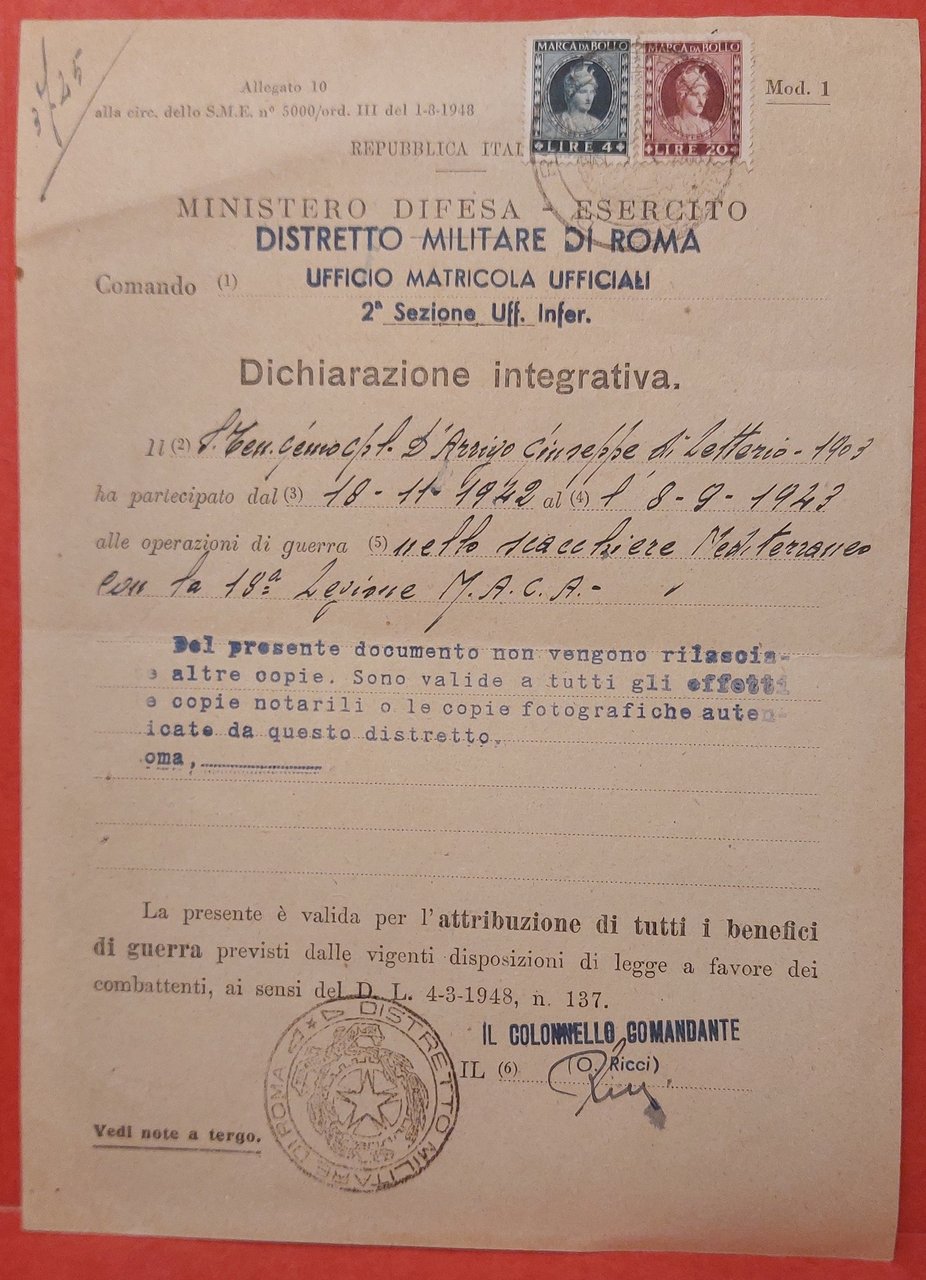 in 8°, documento di valida (rilasciato dall'Ufficio Matricola Ufficiali) per Giuseppe D'Arrigo per l'attribuzione di tutti i benefici di guerra previsti a favore dei combattenti, firmato dal colonello comandante Ricci. Foglio presenta due marche da bollo (4 e 20 lire) e due timbri del distretto militare di Roma.