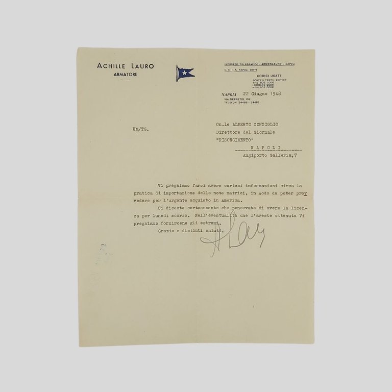 Lettera dattiloscritta con firma autografa indirizzata all’ On.le Alberto Consiglio, direttore del Giornale “Risorgimento”, datata ‘Napoli, 22 giugno 1948’.